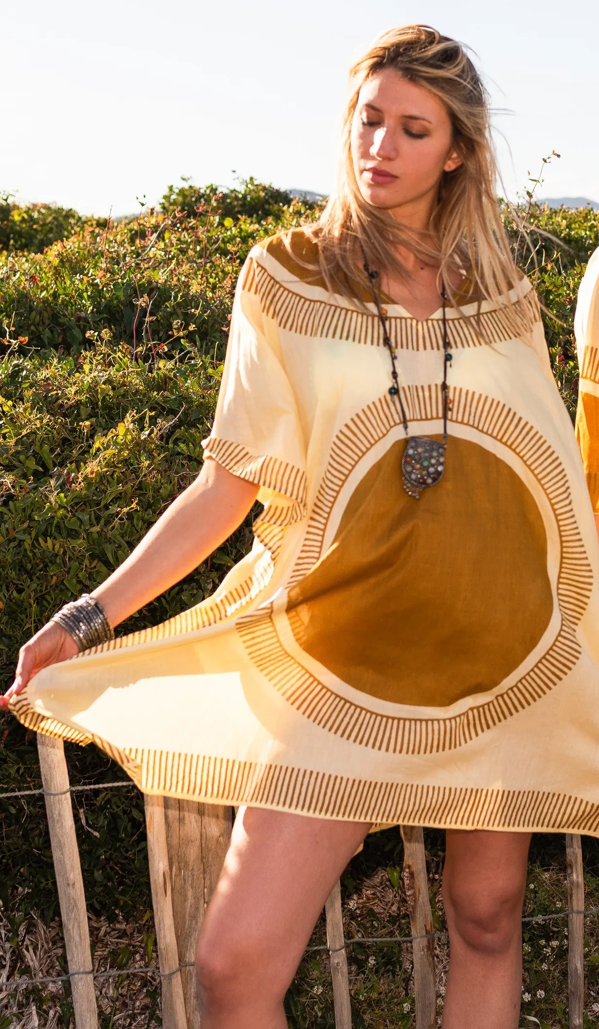 Kaftan en 100 % voile de coton, coupe ample et fluide. Encolure en V, manches larges. Imprimé graphique contrasté sur le devant et les bords. Tissu léger, parfait pour les journées chaudes ou les sorties bord de mer.