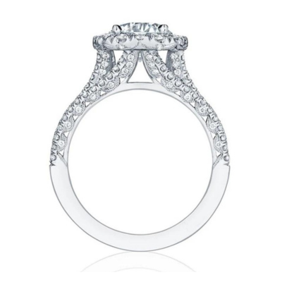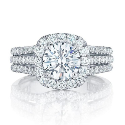 Une magnifique bague de fiançailles sertie d’un diamant taille princesse au centre et d’un diamant rond de chaque côté.