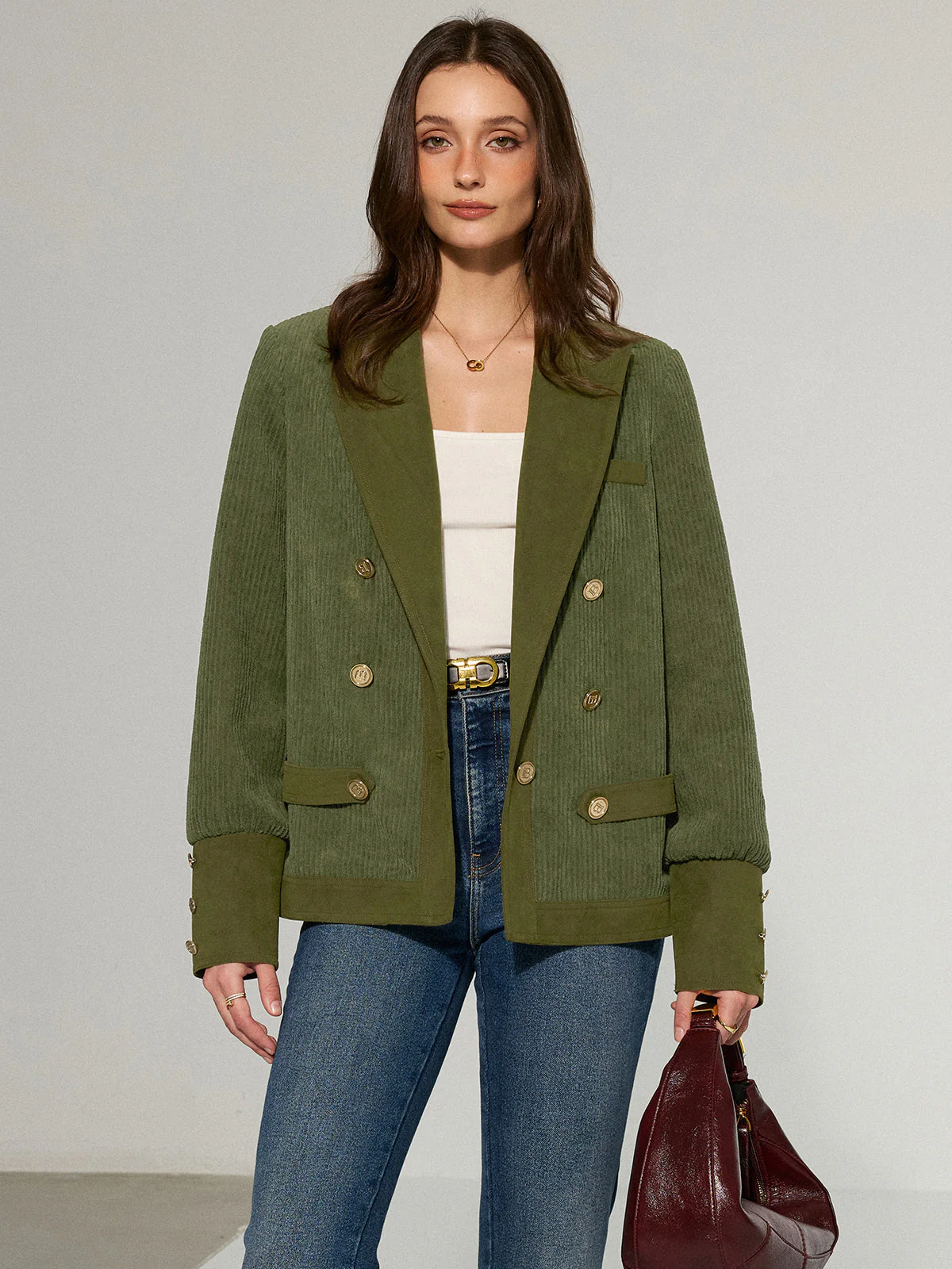 Blazer Femme en Velours Côtelé | Boutons Métalliques & Col Revers Contrasté
