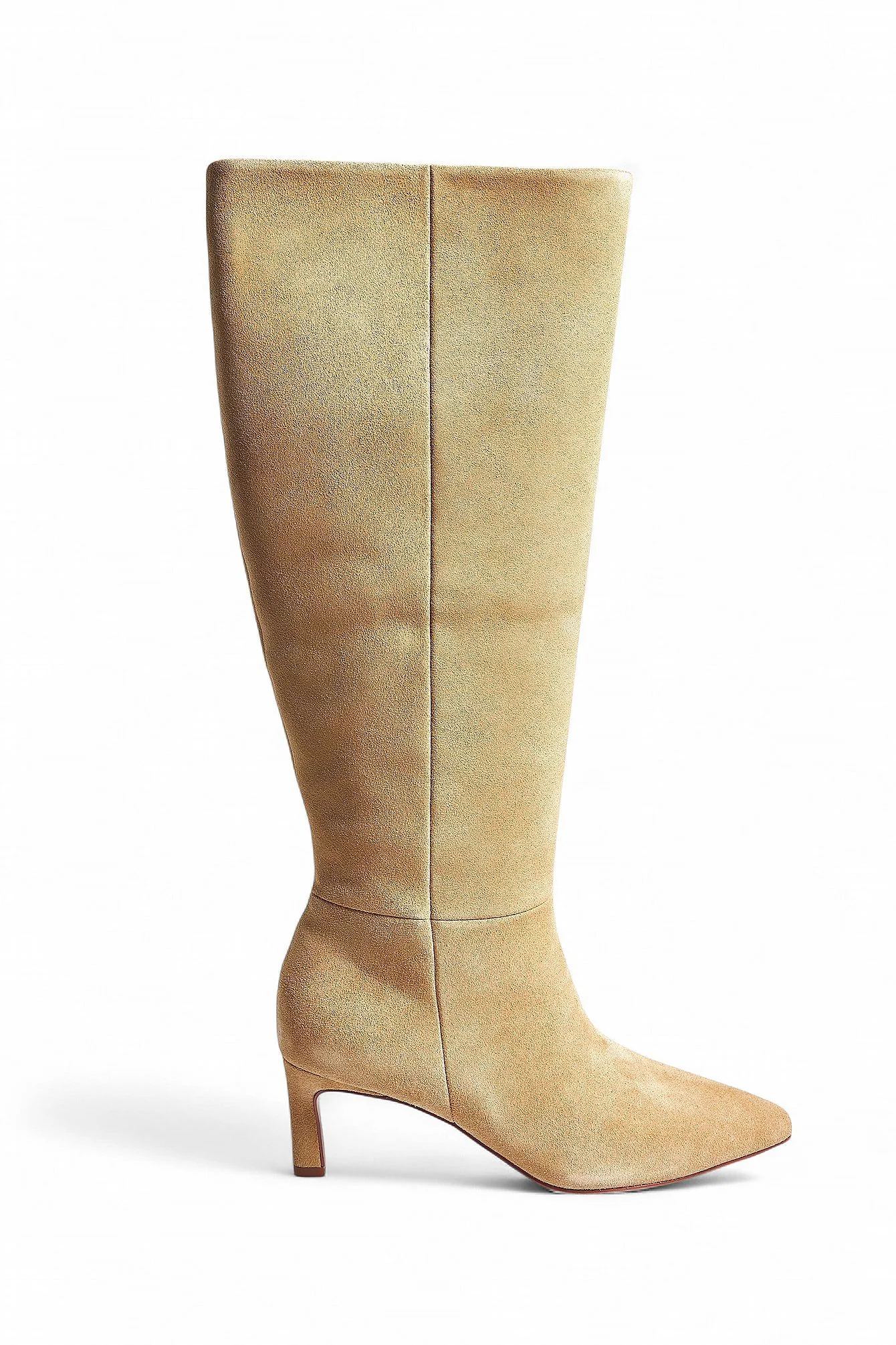 Ce modèle de bottes montantes arrive juste sous le genou, confectionné en cuir de vachette (aspect daim/velours) pour une texture riche et un tombé impeccable. Le bout pointu et le talon carré bas et stable assurent une allure chic sans compromettre le confort. Elles sont parfaites pour les tenues de jour comme de soirée, offrant une élégance discrète et polyvalente.
