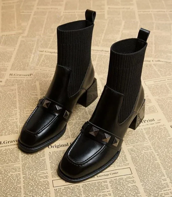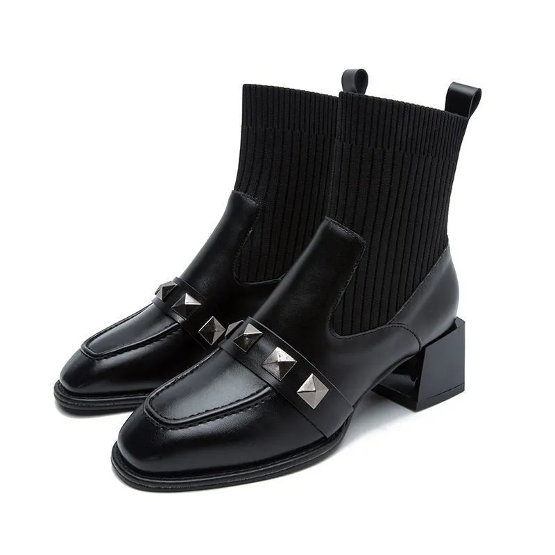 • Style : Bottines chaussettes à talon carré avec clous décoratifs