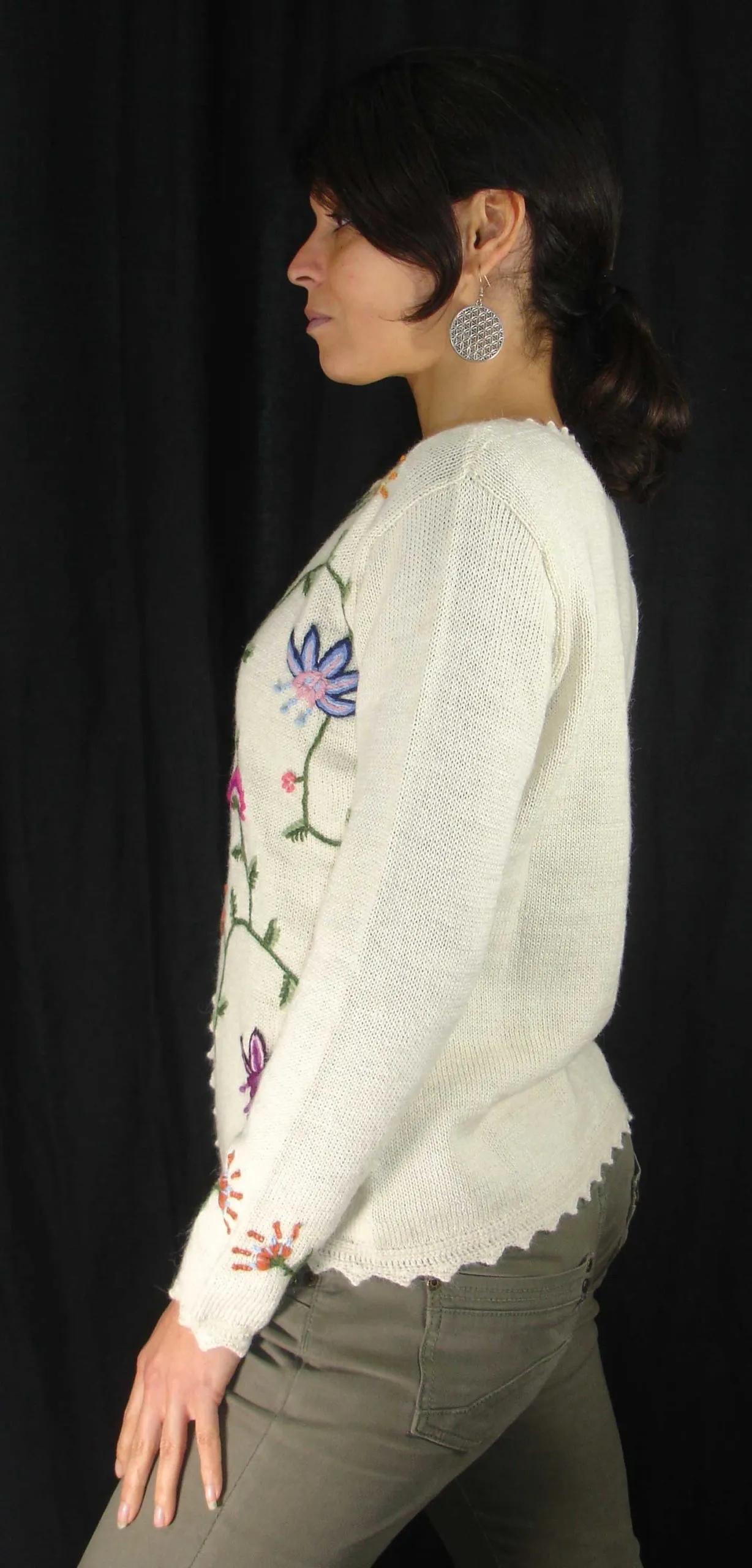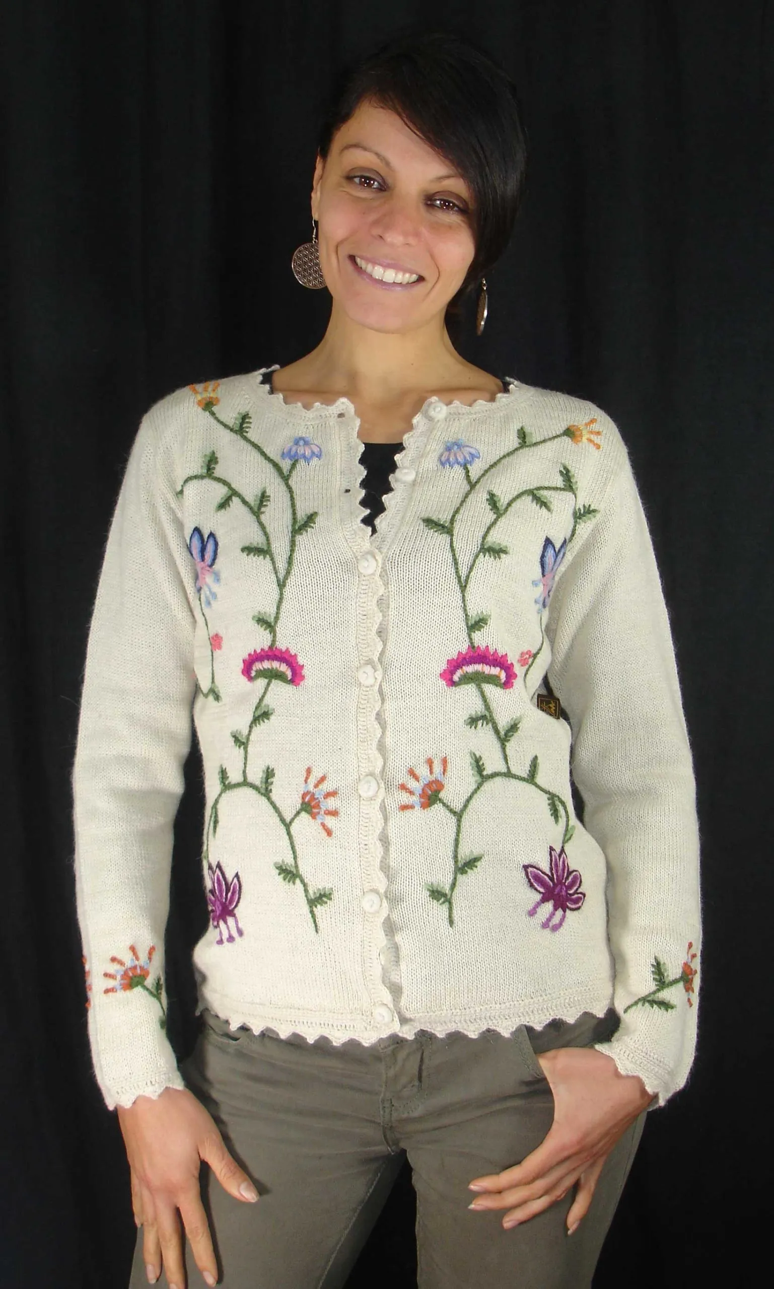 Cardigan beige vintage brodé par-dessus. Motifs floraux, modérément cintré. Boutons fait main. A l’intérieur vous trouverez un bouton de rechange et l’étiquette de composition obligatoire.