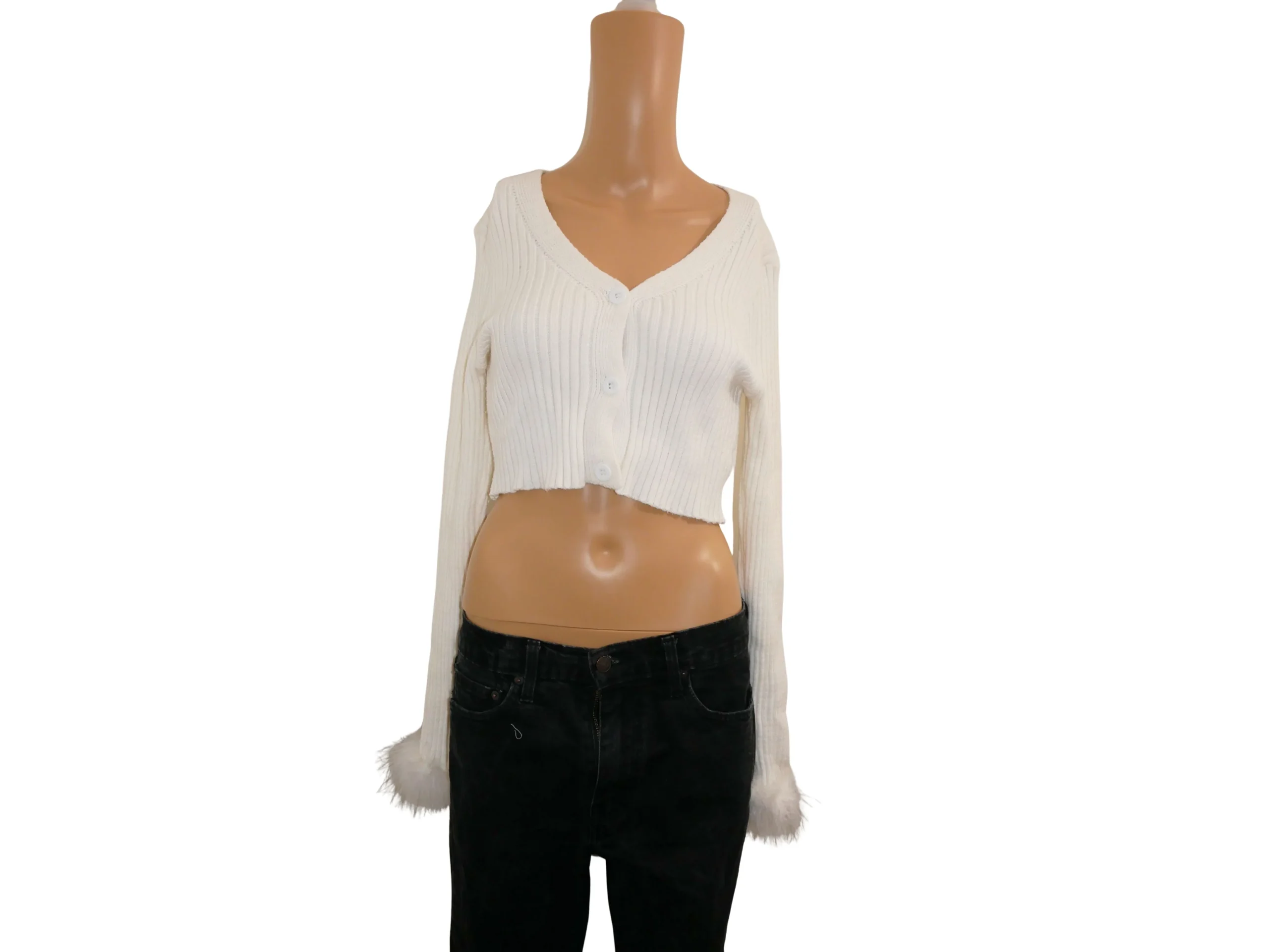 Découvrez ce cardigan blanc élégant de SHEIN, confectionné en maille douce crème agrémentée de poignets en fausses fourrure pour une touche de sophistication. Vêtement féminin de seconde main en excellent état, il allie confort et style intemporel. Parfait pour sublimer vos tenues quotidiennes avec une note de luxe accessible, ce cardigan polyvalent s’adapte à tous vos looks, des plus classiques aux plus tendance.