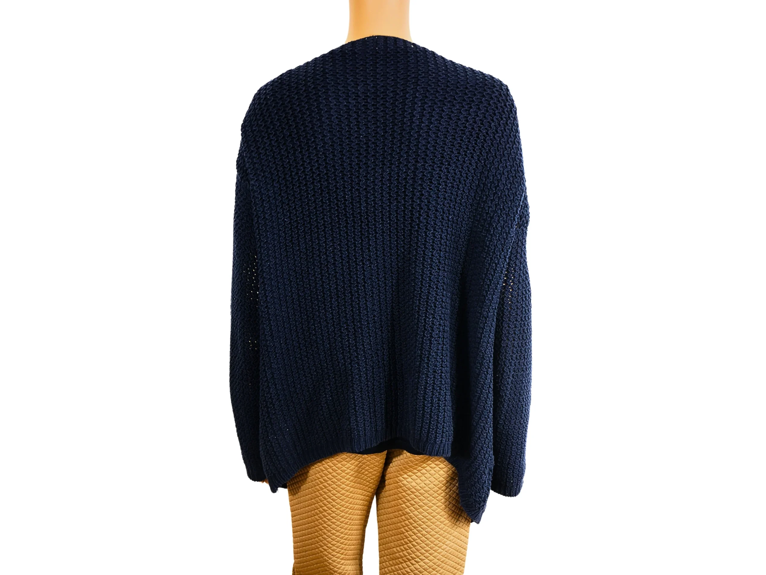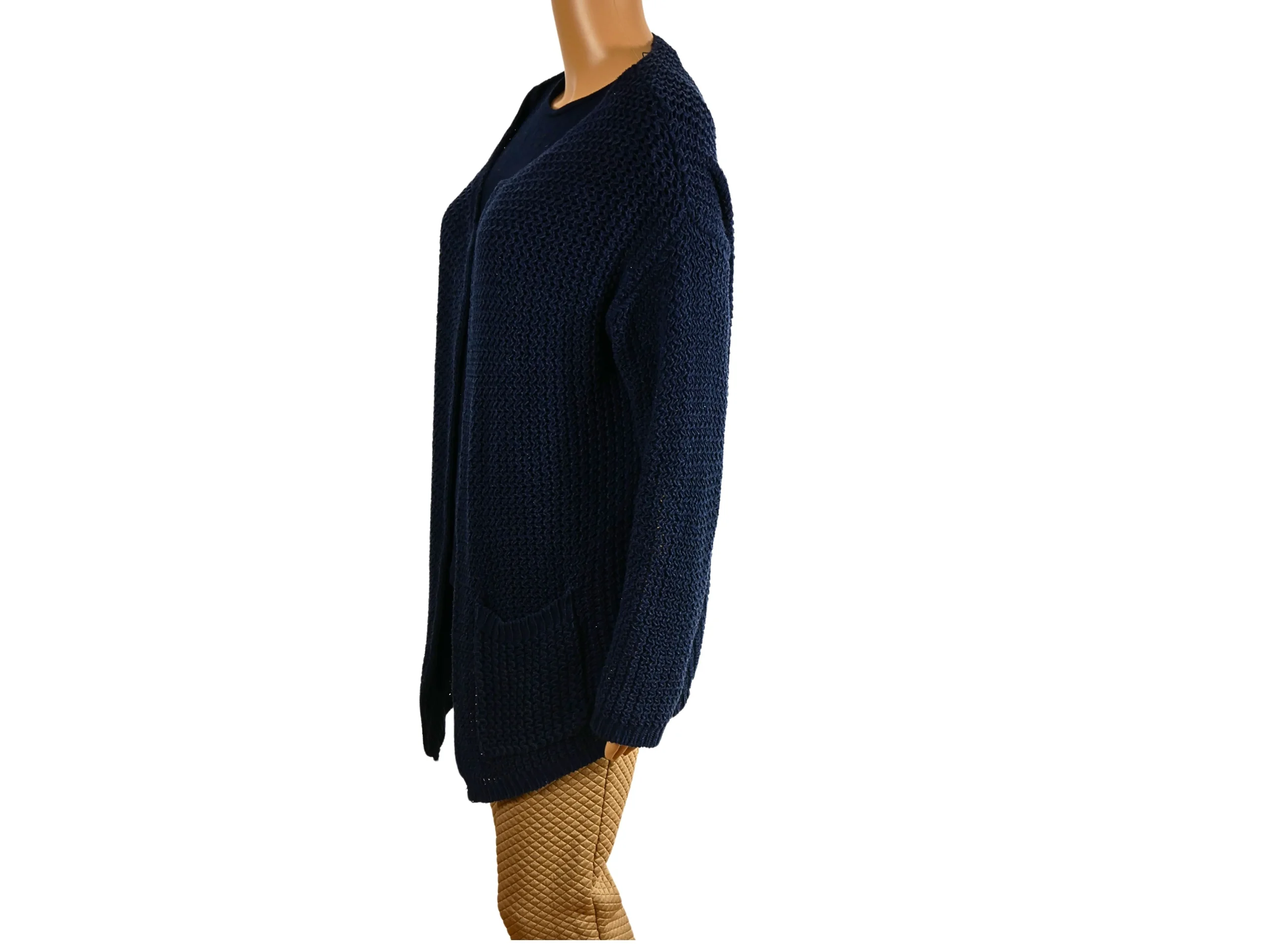 Ce cardigan bleu long pour femme de seconde main est un vêtement idéal pour ajouter une touche de style à votre tenue. Avec sa taille L et ses mesures de 56 cm de largeur et 77 cm de longueur, il convient à la plupart des morphologies. En bon état et de la marque C&A
