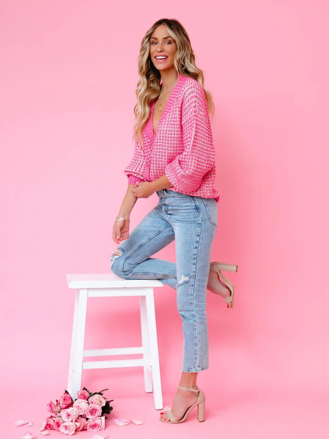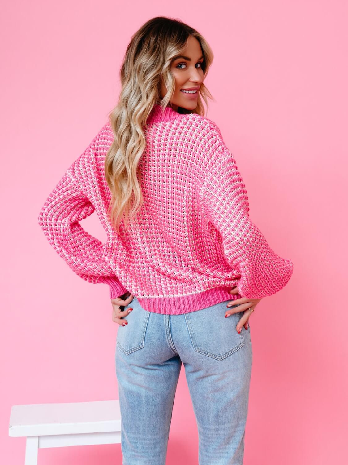 Ce cardigan en maille texturée combine douceur et éclat avec son contraste de rose vif et de blanc. Sa coupe légèrement ample et ses larges boutons apportent un style décontracté et tendance. Idéal pour dynamiser une tenue simple ou accompagner vos looks de week-end.