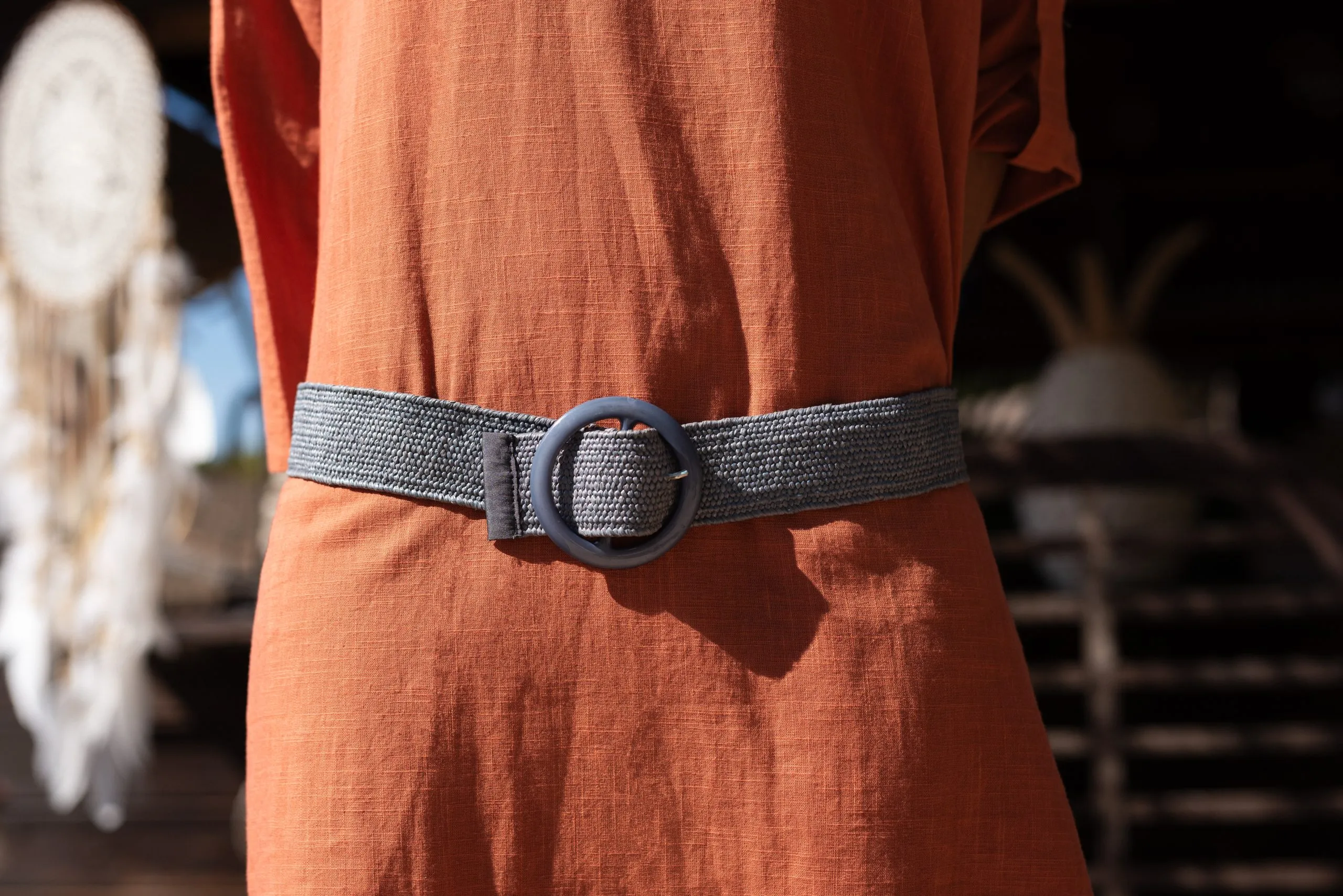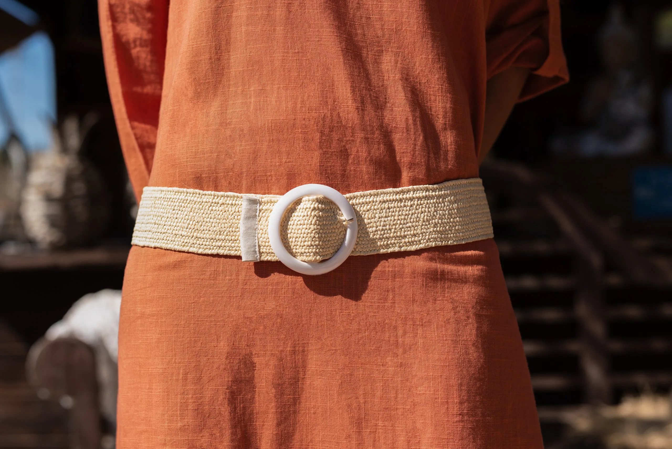 Ceinture en raphia tissé, montée sur une base élastique confortable, avec une large boucle ronde effet bois assortie. Existe en 5 coloris vibrants ou naturels.