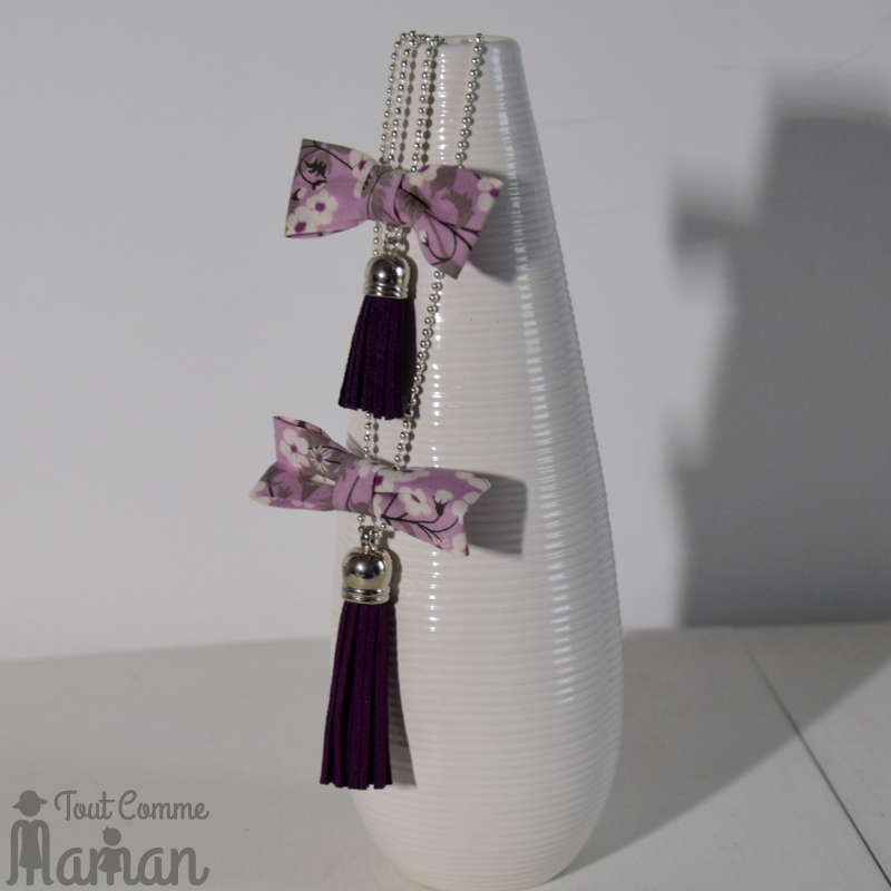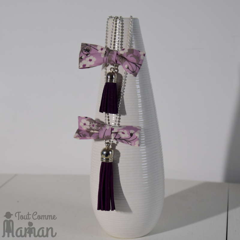Collier femme et fille avec pompon en suédine bordeaux et nœud tissu coton liberty.