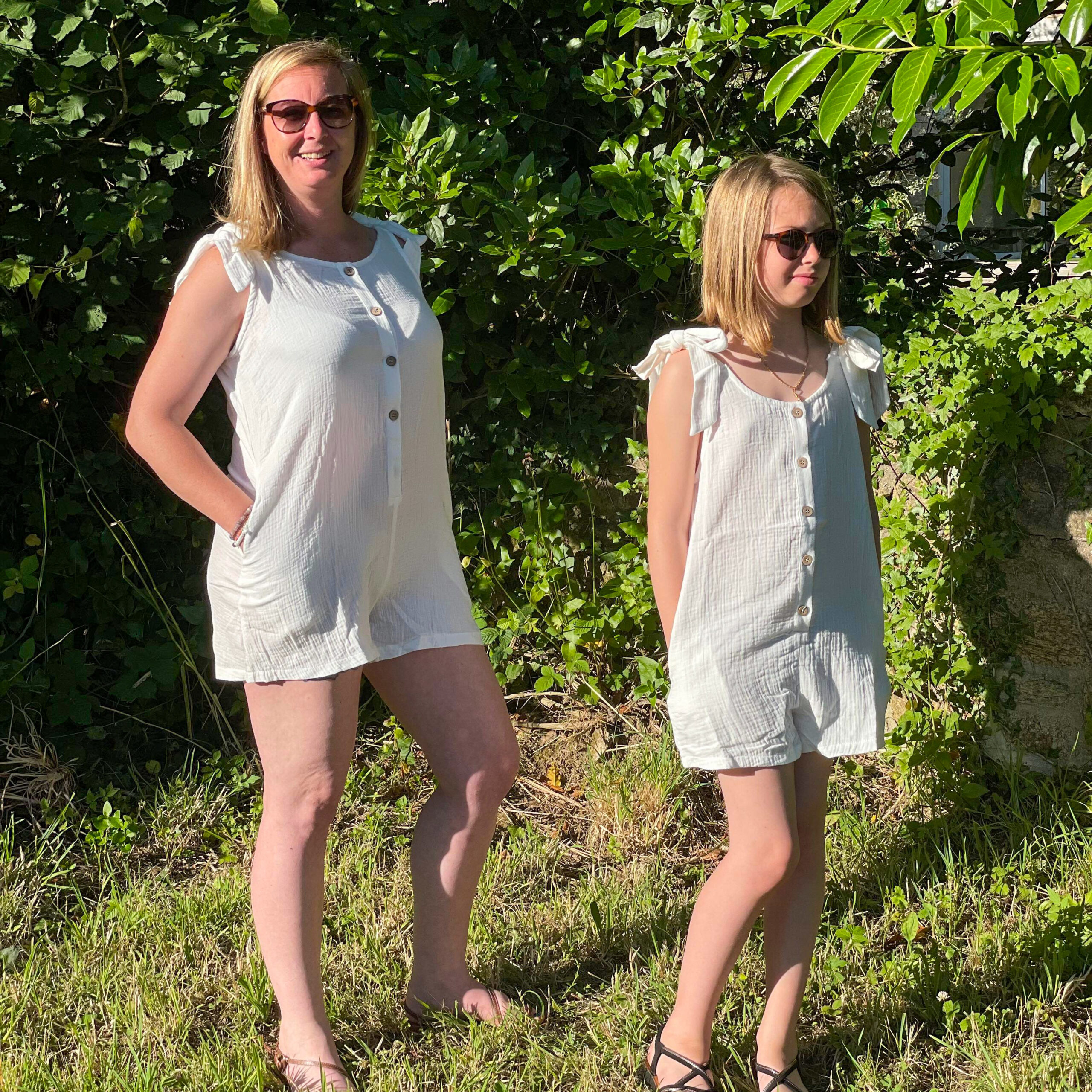 Combi-short gaz de coton léger mère fille à bretelles. Tenu légèrement transparente À partir de 8 ans jusqu’aux 16 ans pour filles. Du M au XL pour femme. Composition : 100% coton.