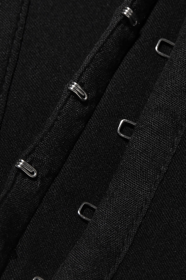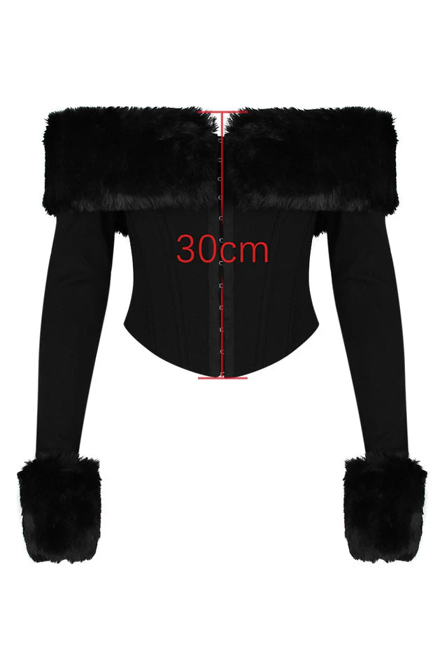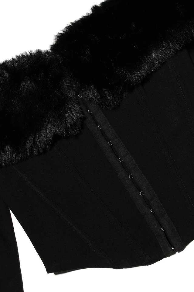 Ce corset épaules dénudées marie l’élégance du similicuir à la légèreté des plumes. Sa coupe cintrée et ses manches amovibles ornées de fourrure apportent une touche résolument sophistiquée.