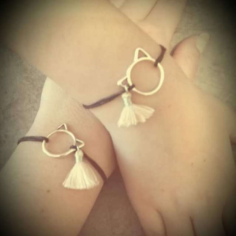 Breloque tête de chat, corde 8 couleurs au choix, et pompon 10 couleurs au choix.