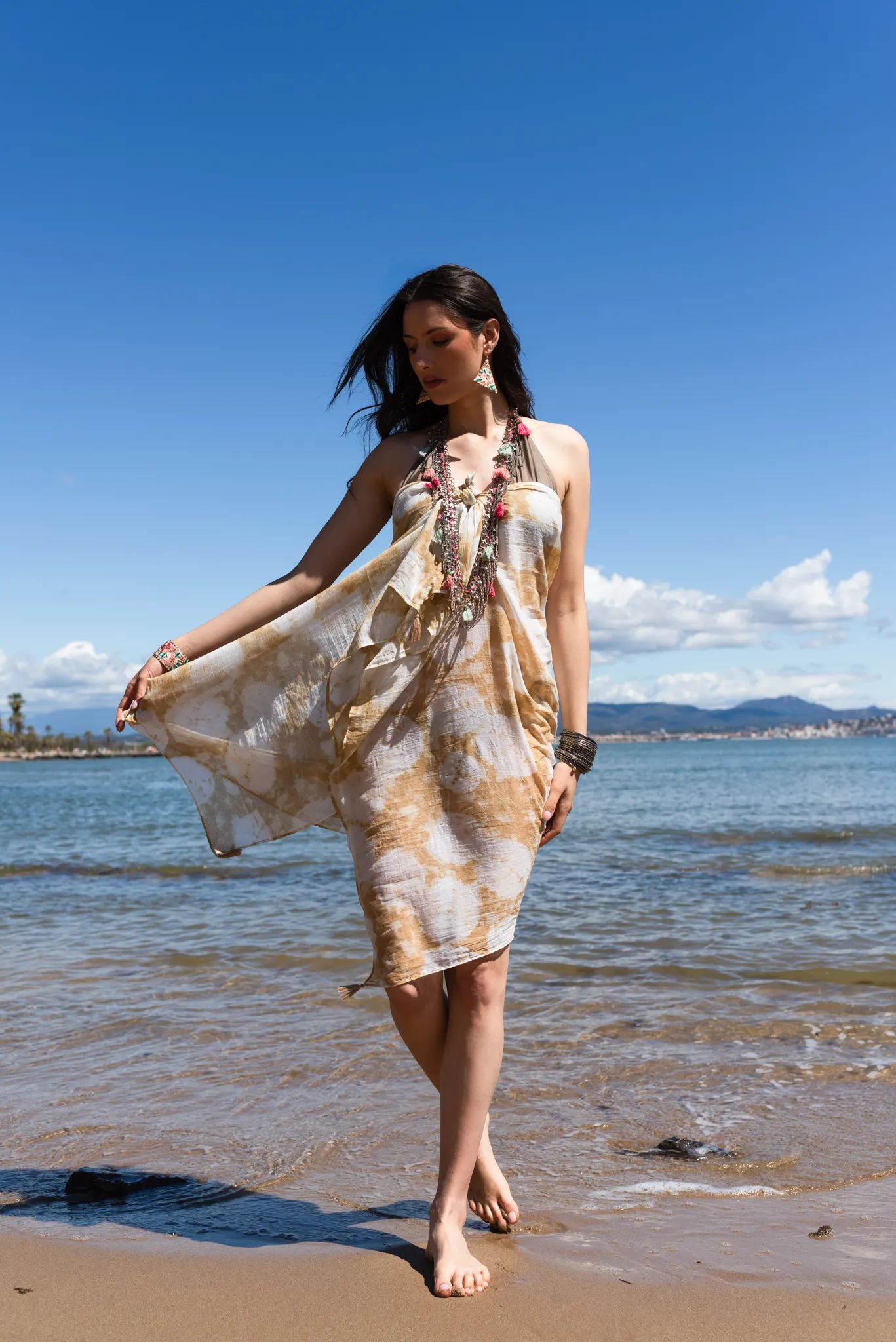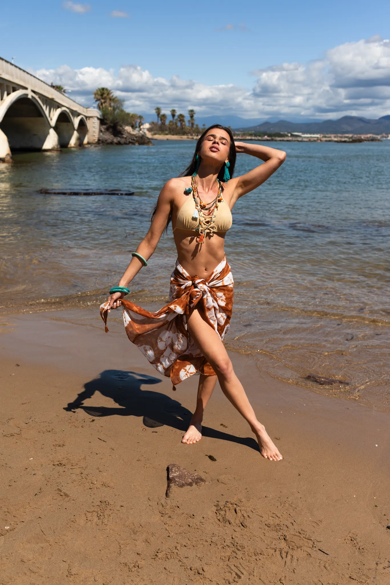 Paréo en voile de coton tie and die, assorti à toute la collection Eldorado. Format généreux (1 m x 1,80 m), à nouer autour de la taille, sur les épaules ou façon robe. Orné de pompons ton sur ton aux quatre coins.