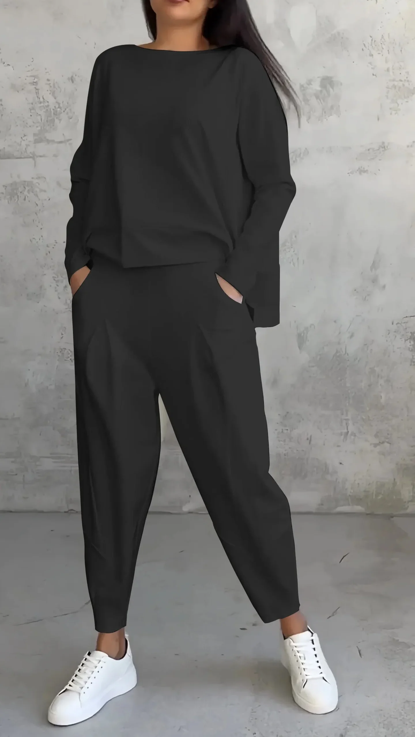 Adoptez le style minimaliste et confortable avec cet ensemble deux pièces pour femme, idéal pour le quotidien, le voyage ou le télétravail. L’ensemble est composé d’un haut ample à manches longues avec une encolure bateau et d’un pantalon moderne.