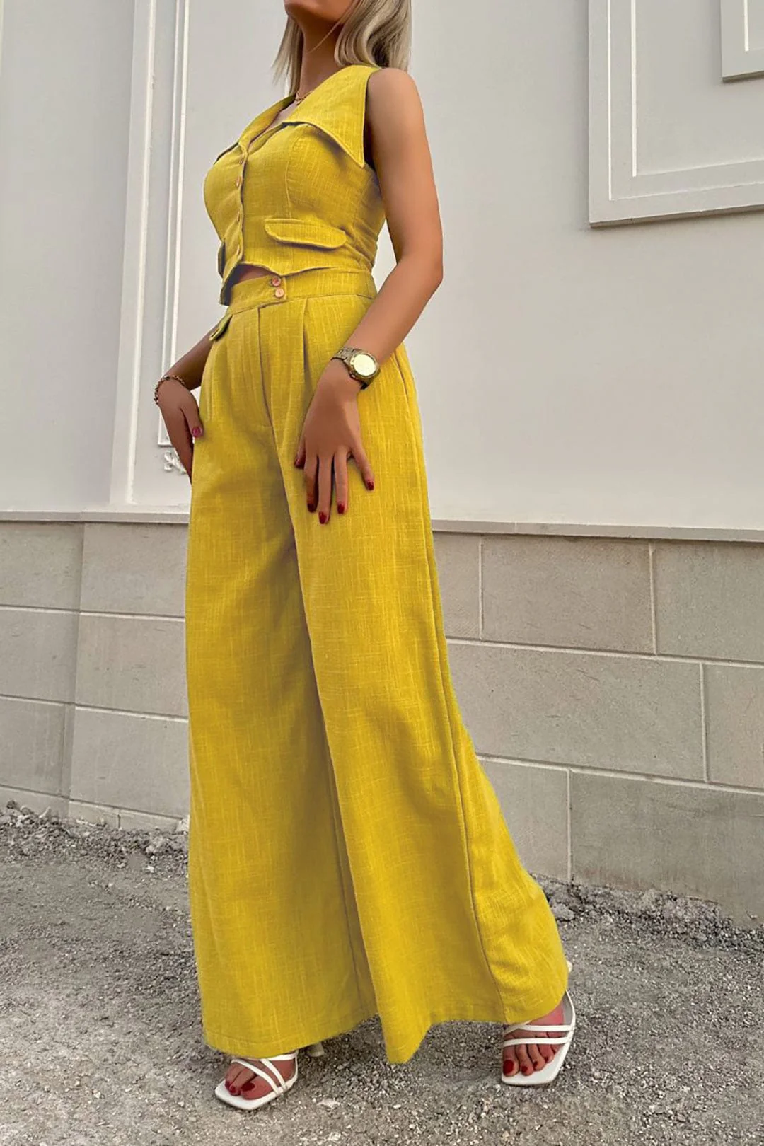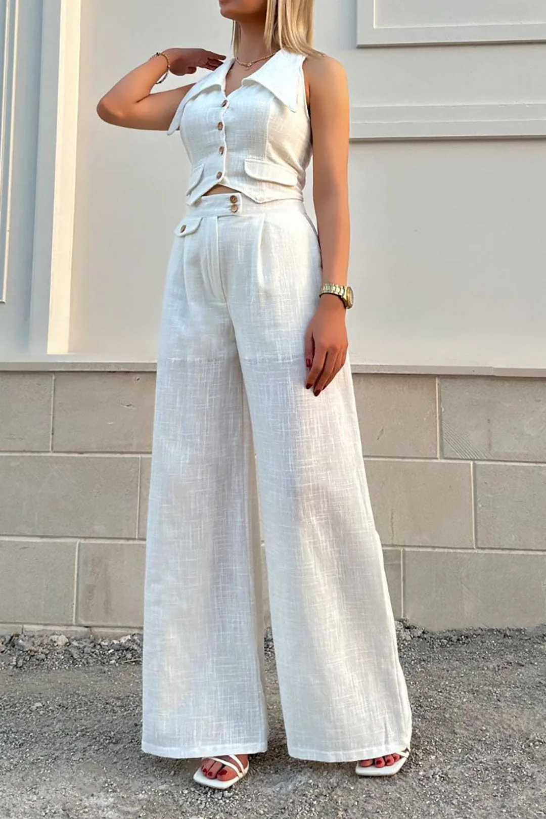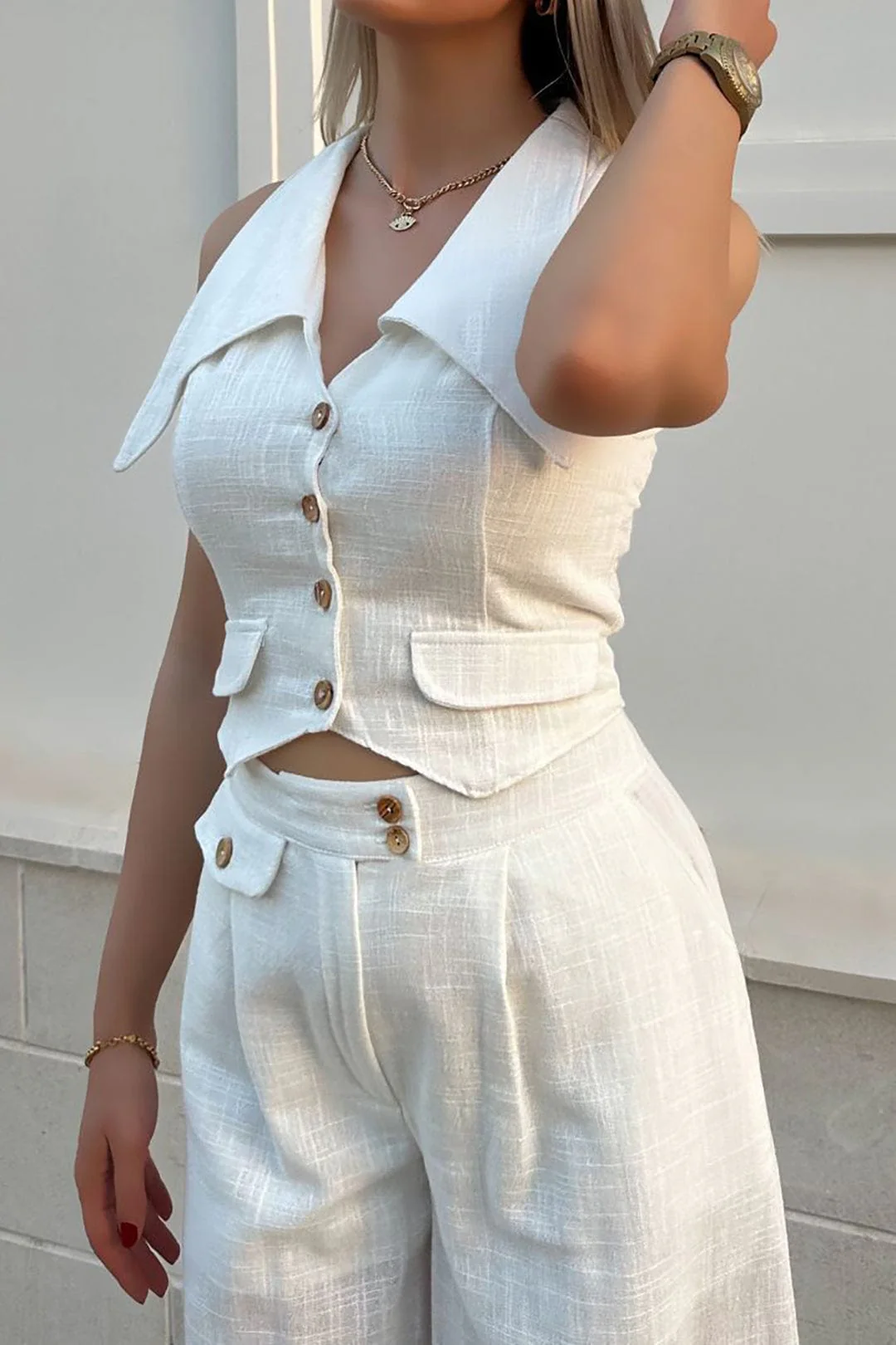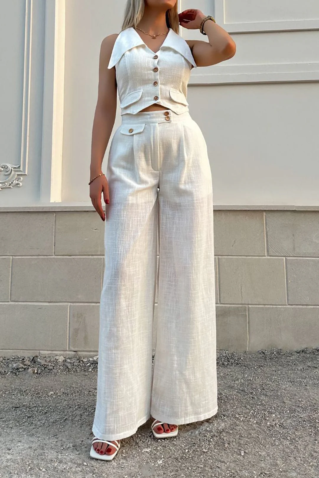 Cet ensemble signé Maison Nova marie la douceur du lin à une coupe moderne et féminine. Le gilet court à col V et le pantalon taille haute à jambe large offrent confort et style en toutes circonstances.