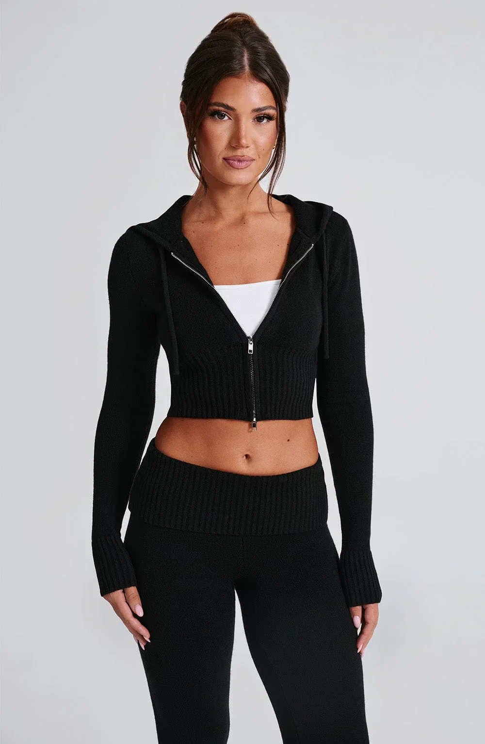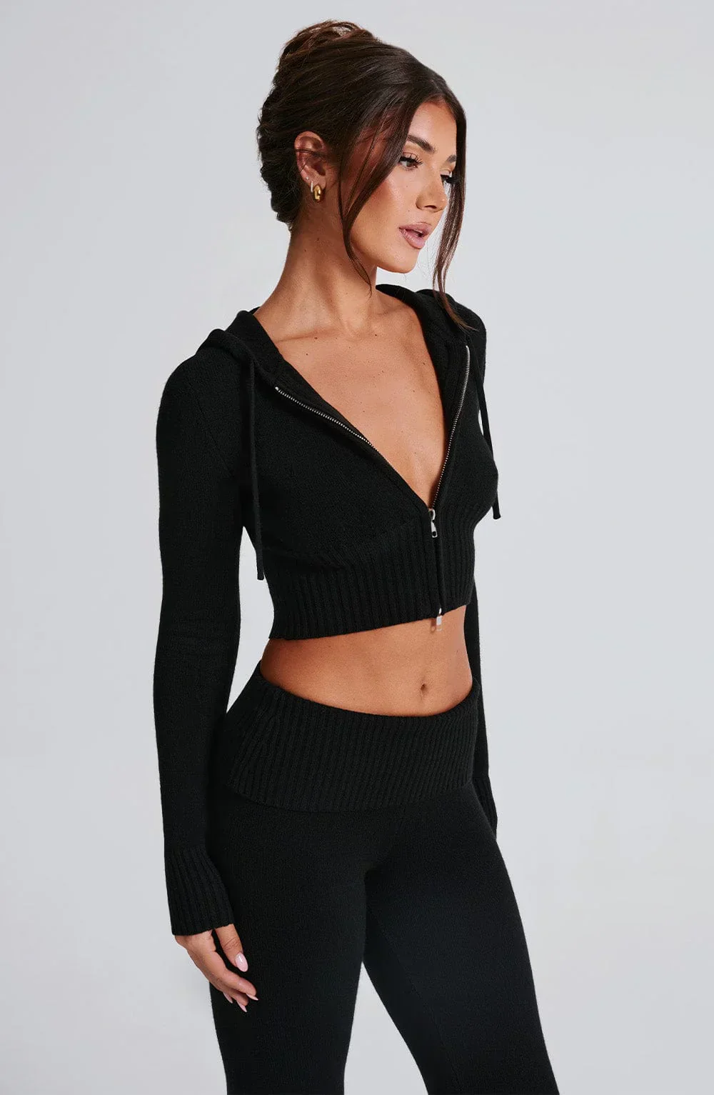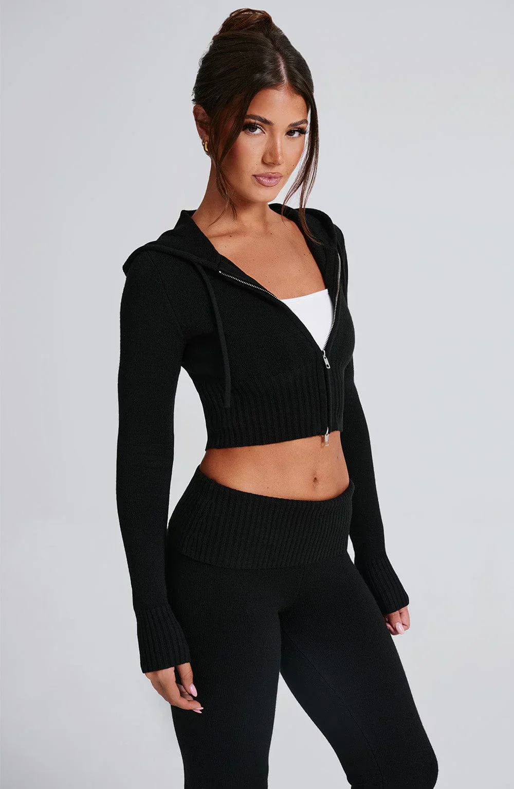 Cet ensemble deux pièces en maille offre un équilibre parfait entre confort et allure tendance. Sa coupe ajustée, son zip sur le haut à capuche et son pantalon évasé subliment la silhouette tout en procurant une sensation cosy idéale pour l’automne ou les soirées fraîches.