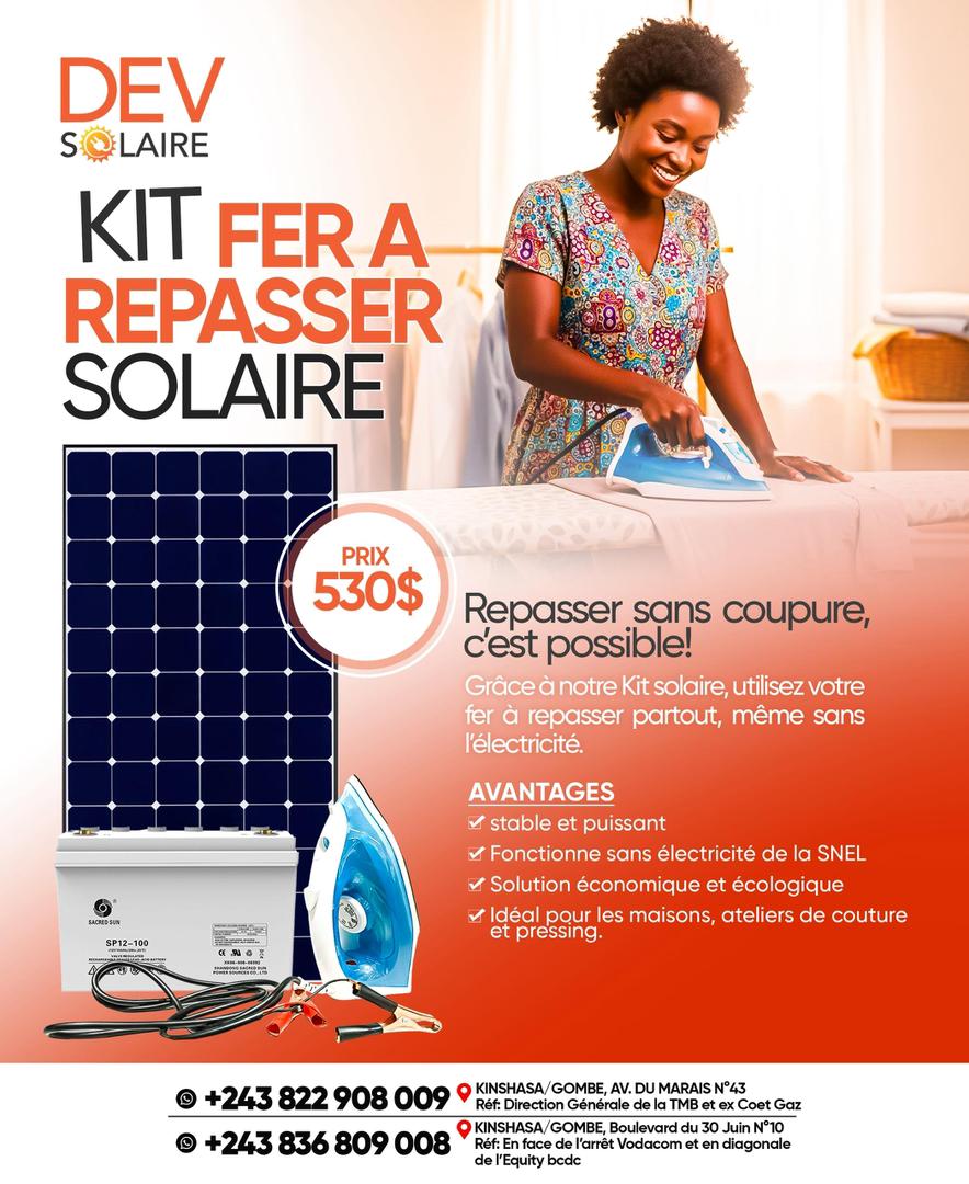 Le kit fer à repasser solaire DEV Solaire est une solution pratique et innovante permettant de repasser le linge sans dépendre de l’électricité de la SNEL. Grâce à l’énergie solaire, ce kit assure un fonctionnement stable et puissant du fer à repasser, même en cas de coupures prolongées. Il comprend un panneau solaire, une batterie et les accessoires nécessaires pour une utilisation immédiate. Économique, écologique et fiable, ce kit est idéal pour les maisons, ateliers de couture et services de pressing.