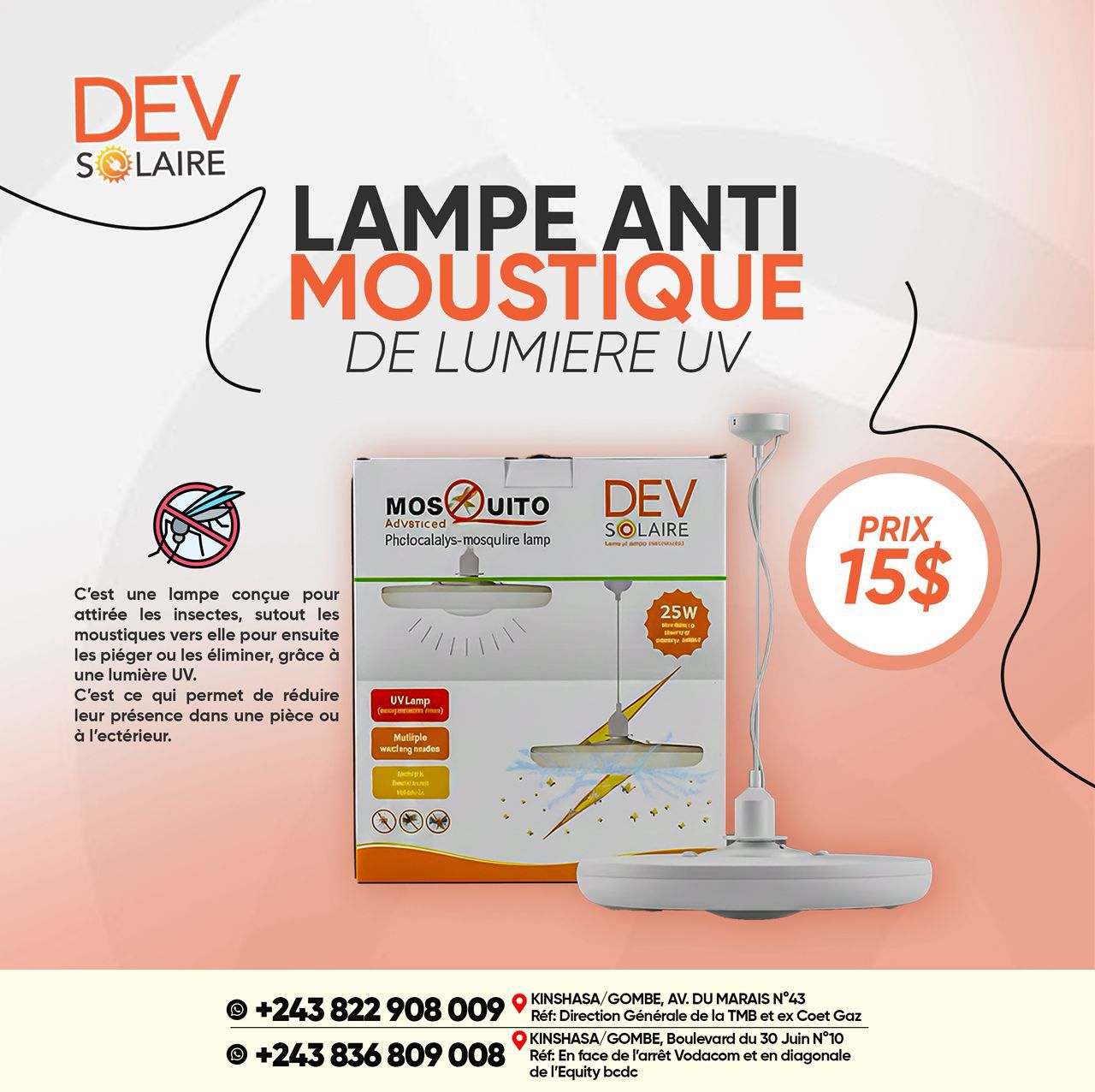 La lampe anti moustique UV DEV Solaire est conçue pour attirer et éliminer efficacement les moustiques et insectes volants grâce à une lumière ultraviolette performante. Elle fonctionne sans produits chimiques, sans odeur et sans danger pour l’homme. Adaptée à un usage intérieur et extérieur, elle permet de réduire significativement la présence des moustiques dans les maisons, bureaux et commerces. Avec sa puissance de 25W, elle offre un excellent rendement tout en restant économique en énergie. Facile à installer au plafond, elle garantit confort et tranquillité au quotidien.