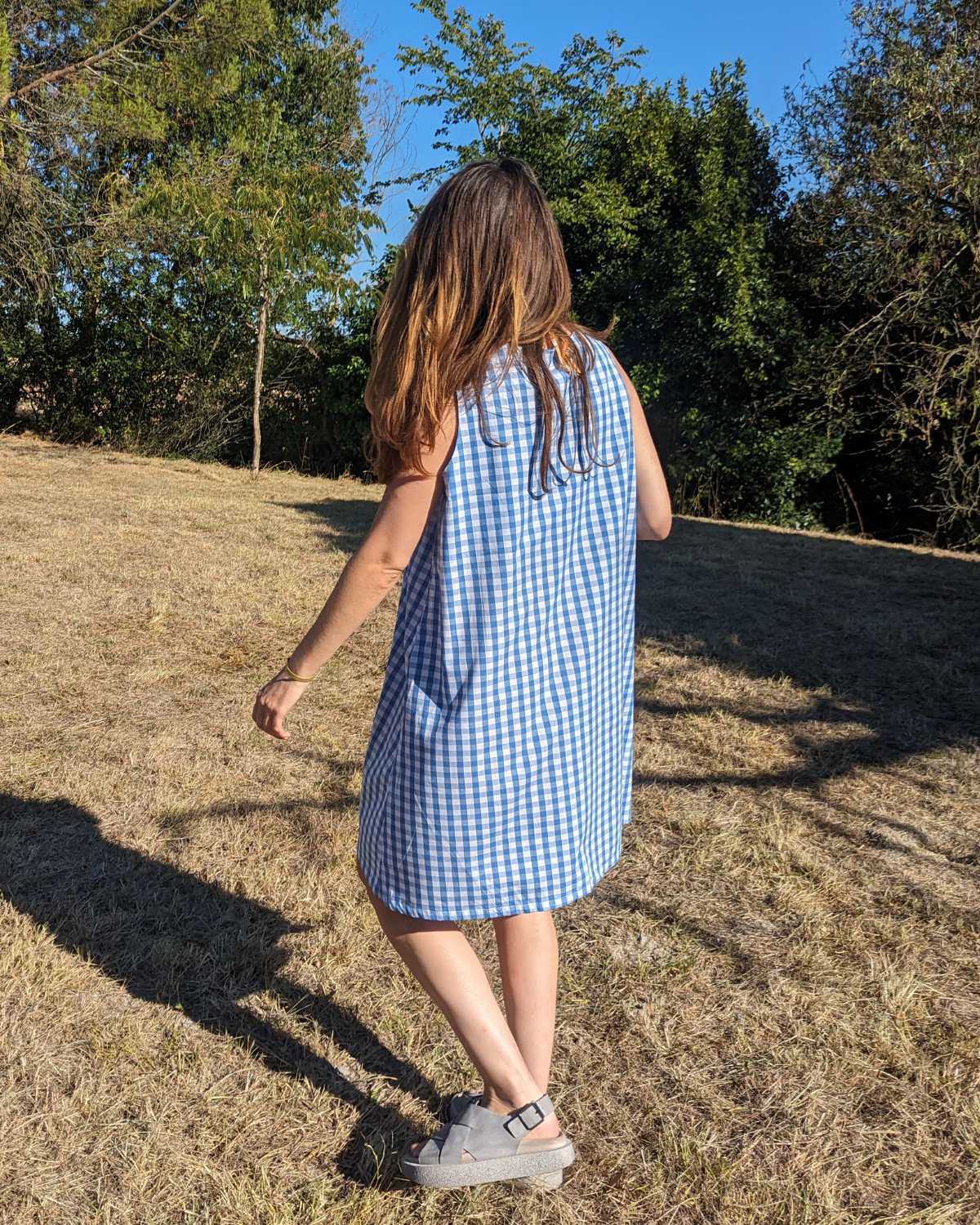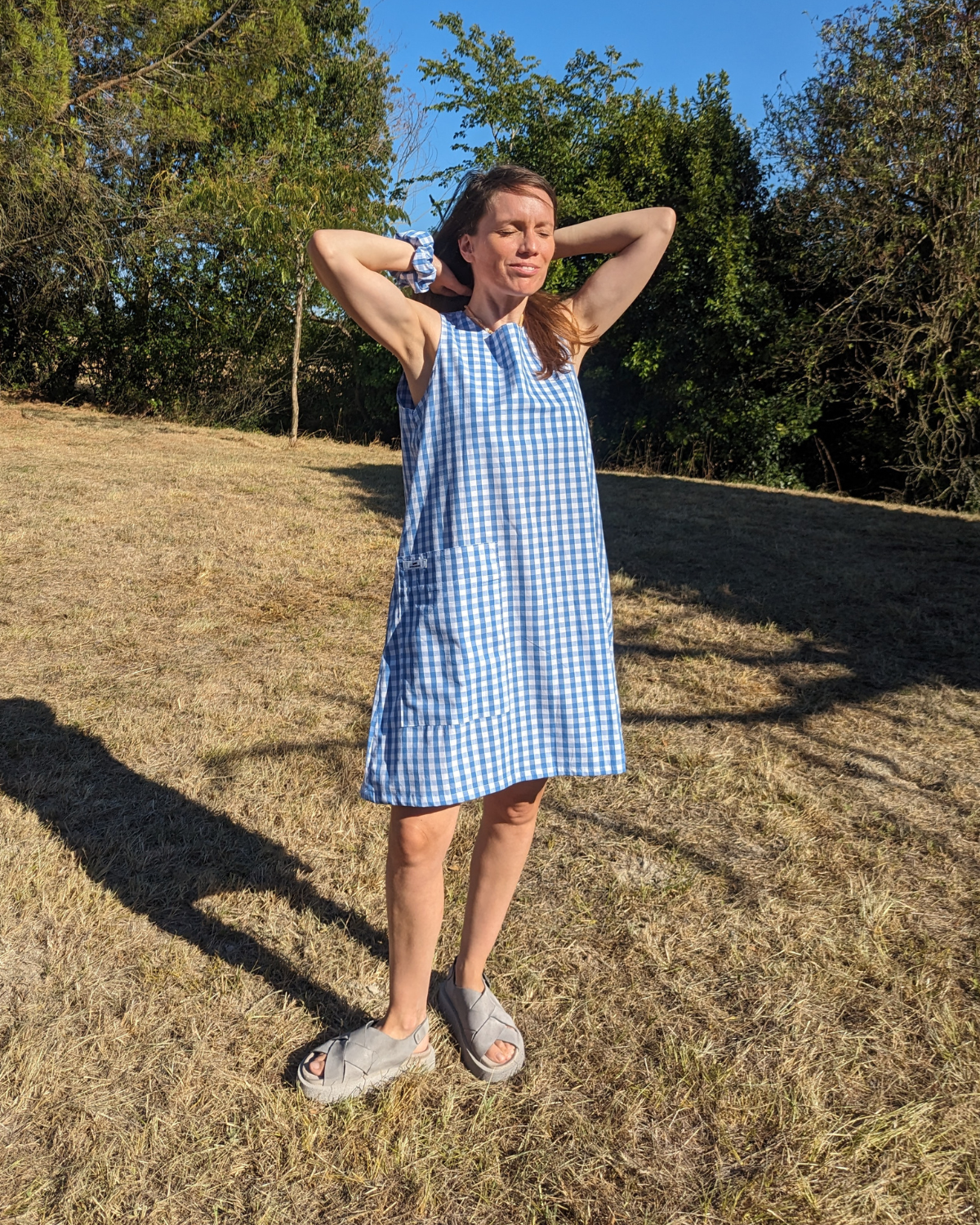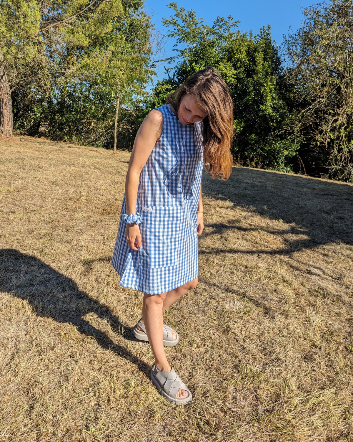 An exclusive KOTCH&THEGANG creation, lovingly crafted in France.🌿 Description : Choose this lightweight, summery dress in blue gingham cotton, with a retro yet modern charm. Its loose, flowing cut suits all body shapes and guarantees absolute comfort all day long.💡 This dress is sold with its matching scrunchie✨Fit: Loose, sleeveless, above-the-knee length. Pattern:  blue gingham . Material: 100% soft and breathable cotton. Details: Patch pocket on the front,Small KOTCH&THEGANG signature label. This dress is sold with its matching scrunchie. Care: Machine wash at 30°C, cool iron.Manufacturing: 100% Made in France – independent workshop. 🧵 Responsible manufacturing : At KOTCH&THEGANG, each piece is designed and sewn  with respect for artisanal know-how and ethical values. Support creative, local, and joyfully responsible fashion.📏 Size guide :Front width at chest: 52 cm, Dress length: 90 cm. 🌞 When to wear it? In summer, bare legs and sandals In spring, with a denim jacket