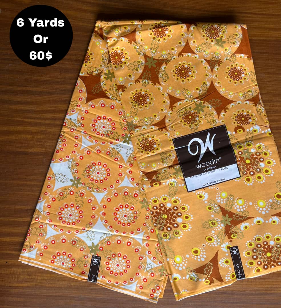Tissu Woodin 6 Yards Or – Ambre Chaud, Élégance et Polyvalence Le tissu Woodin 6 yards en Ambre Chaud allie qualité premium et style raffiné. Idéal pour confectionner robes, chemises, boubous, pagnes, ensembles sur mesure ou accessoires, il offre des couleurs riches et profondes qui restent éclatantes même après plusieurs lavages. Léger, agréable au toucher et facile à travailler, ce tissu permet de réaliser des créations élégantes, durables et pleines de caractère, apportant une touche sophistiquée et lumineuse à chacun de vos projets.