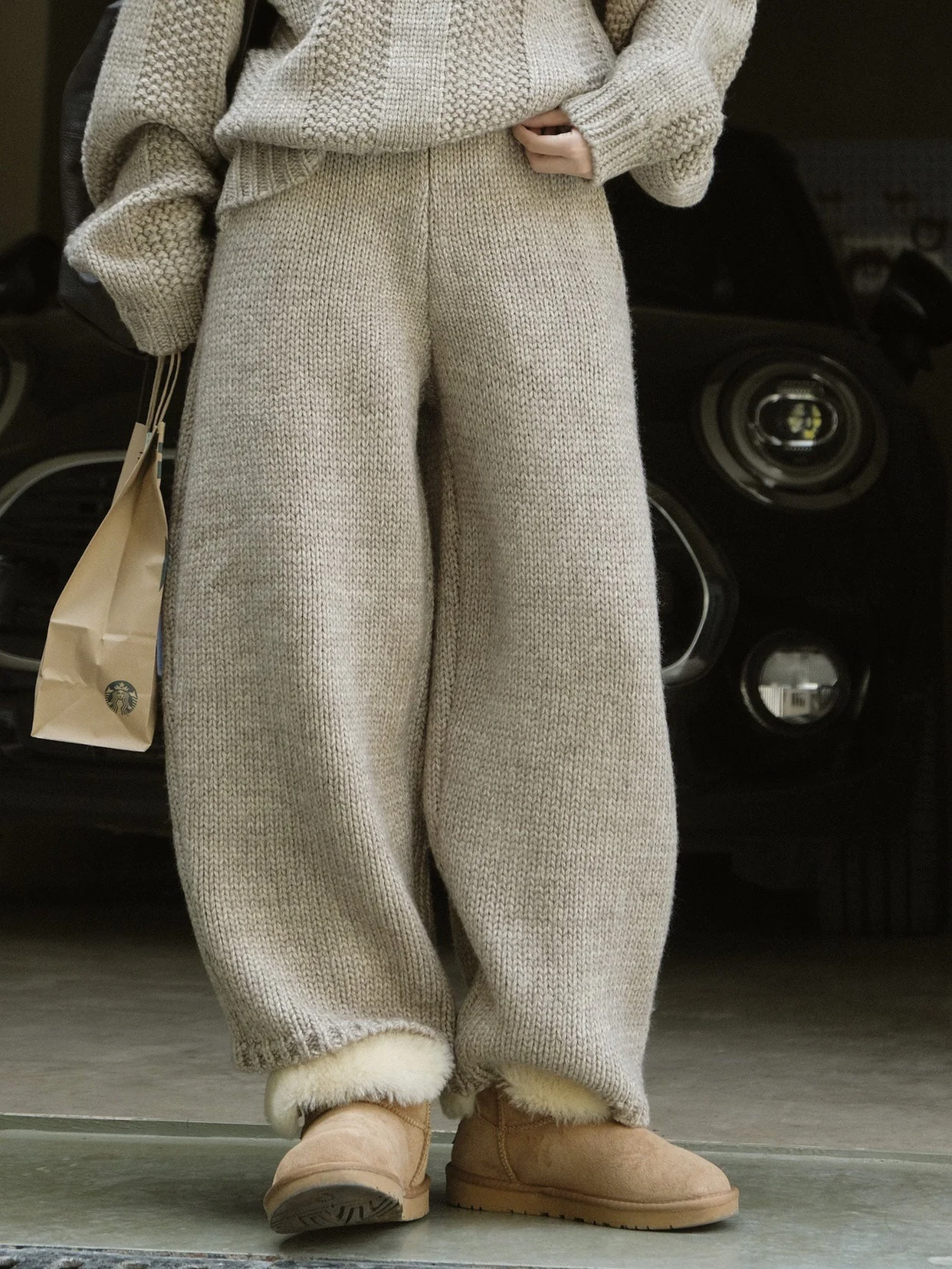 Ce pantalon large signé Maison Nova associe douceur et chaleur grâce à son tricot épais. La taille élastiquée et l’ourlet orné d’une bordure en fausse fourrure offrent une silhouette décontractée et stylée.