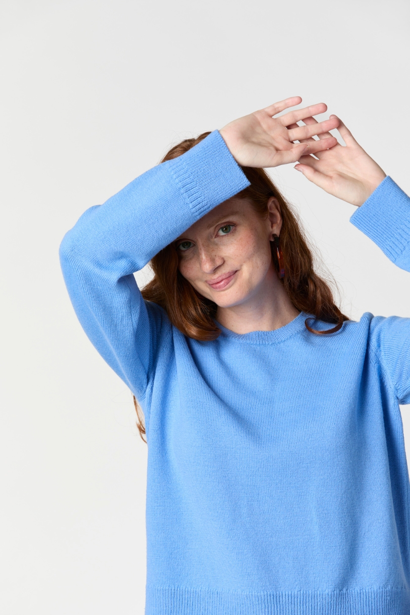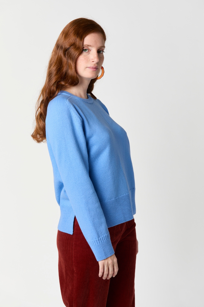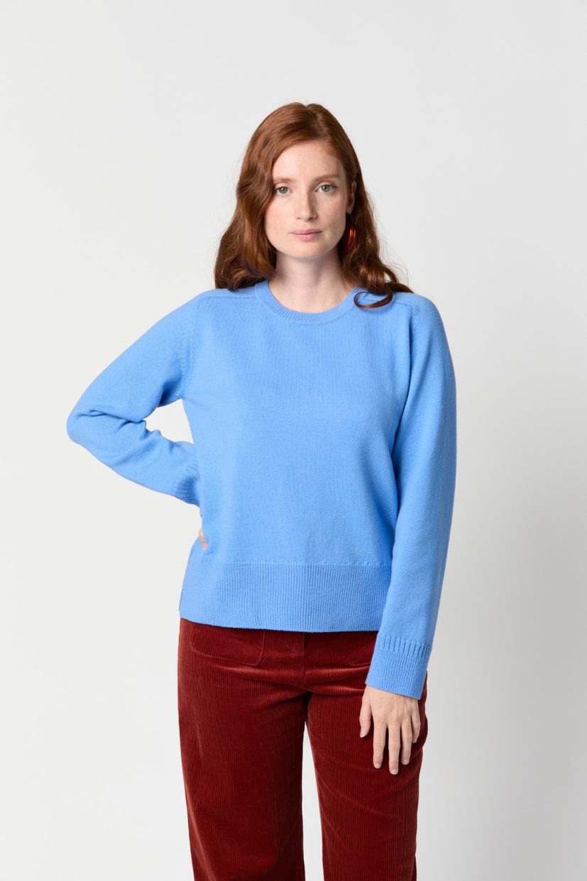 Le pull en laine made in France pour femme bleu Zoé est tricoté dans notre fil exclusif 100% pure laine mérinos française.