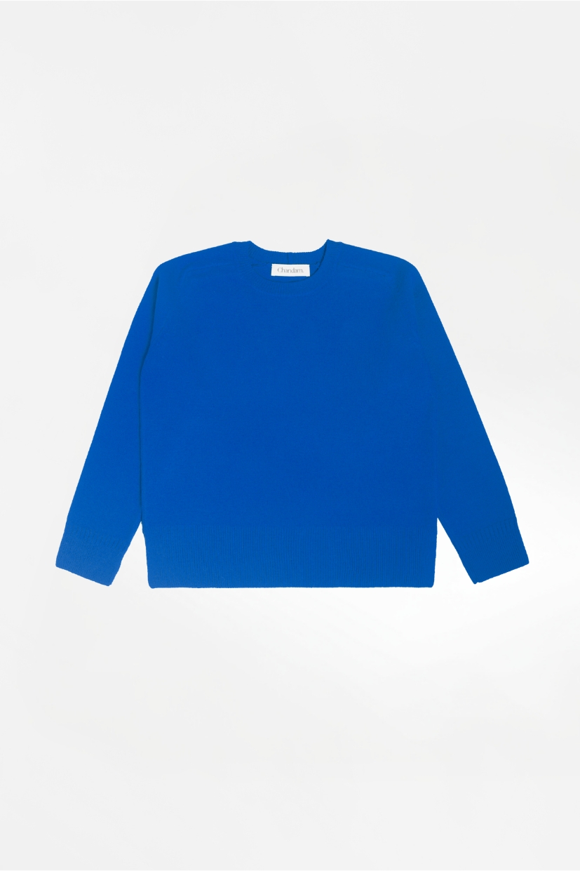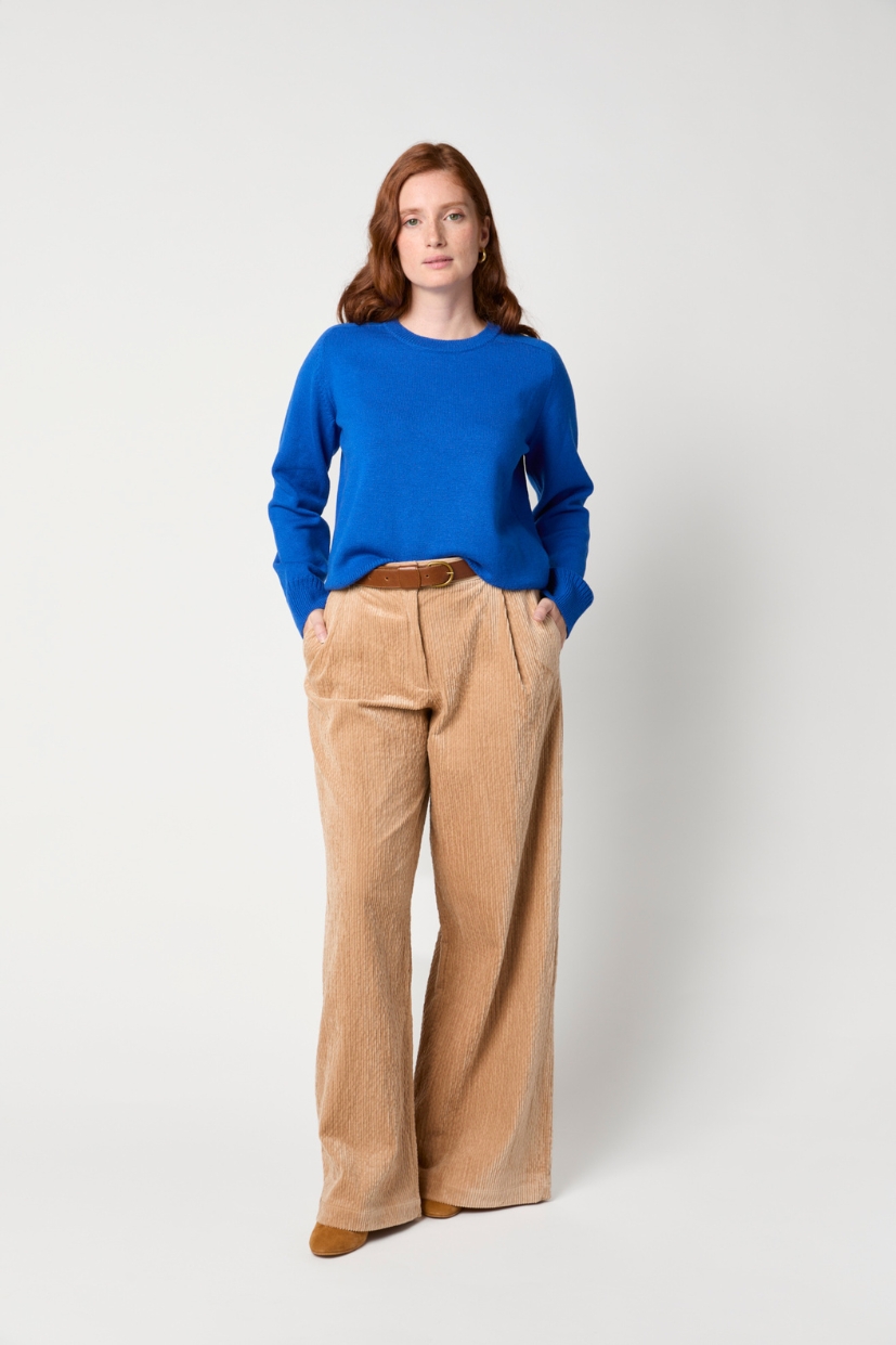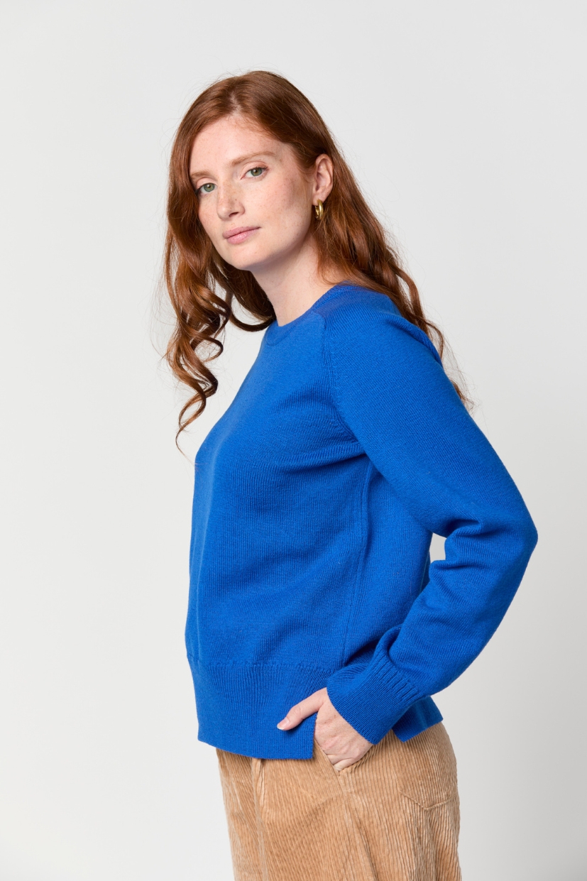 Le pull femme made in France bleu Electricité Zoé est tricoté dans notre fil exclusif 100% pure laine mérinos française.
