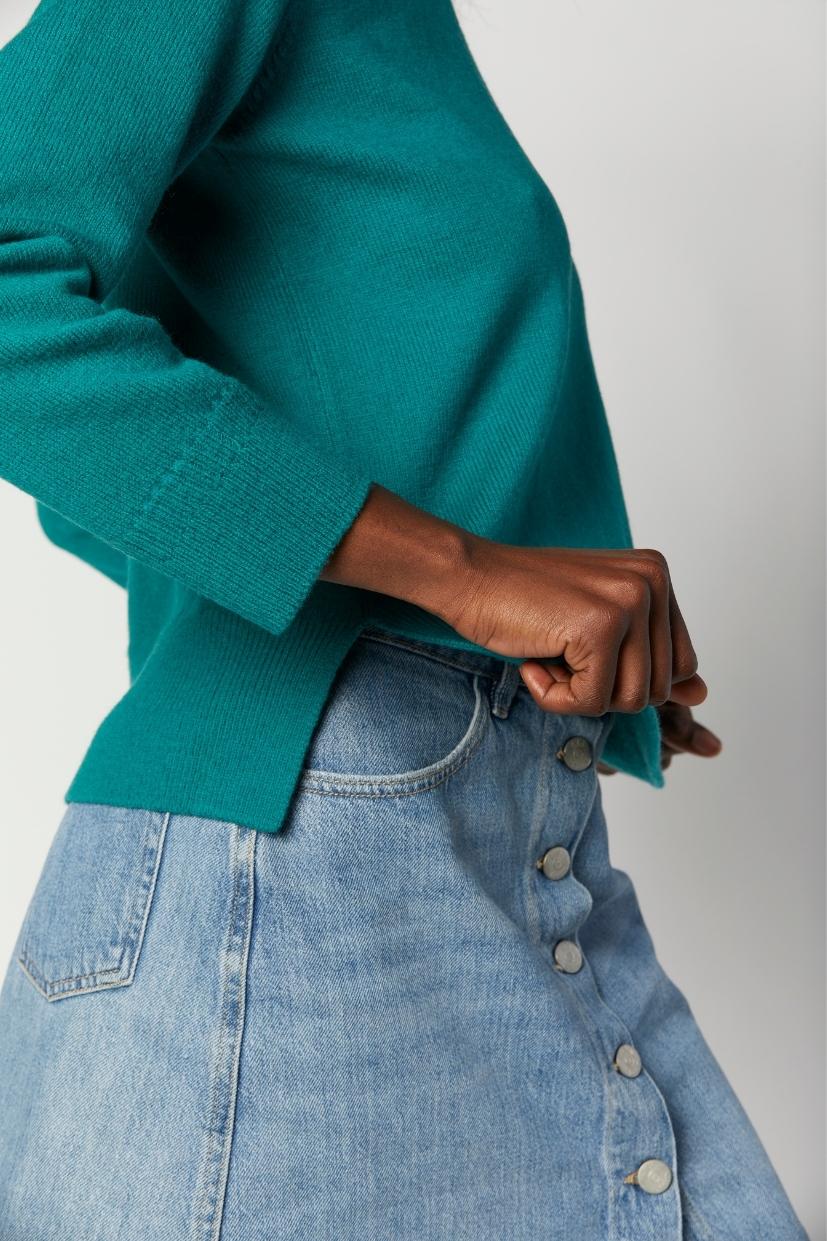 Portez ce pull au coloris vert Emeraude profond et vif comme bon vous semble ! Amusez-vous à créer avec cette couleur des looks tantôt décontractés tantôt sophistiqués.