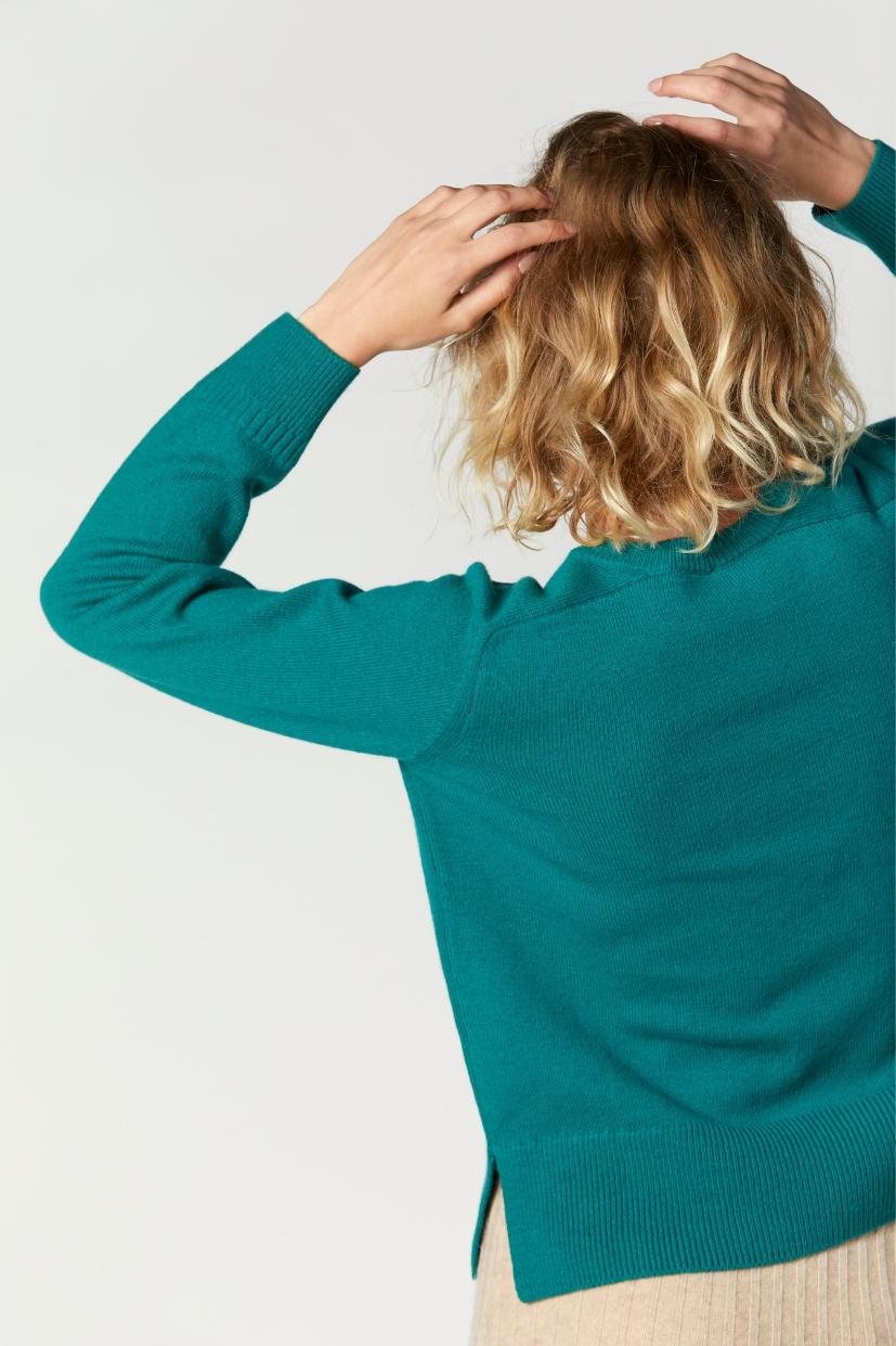 Le pull Zoé Émeraude est en 100% pure laine mérinos d’Arles et nécessite donc peu d’entretien.