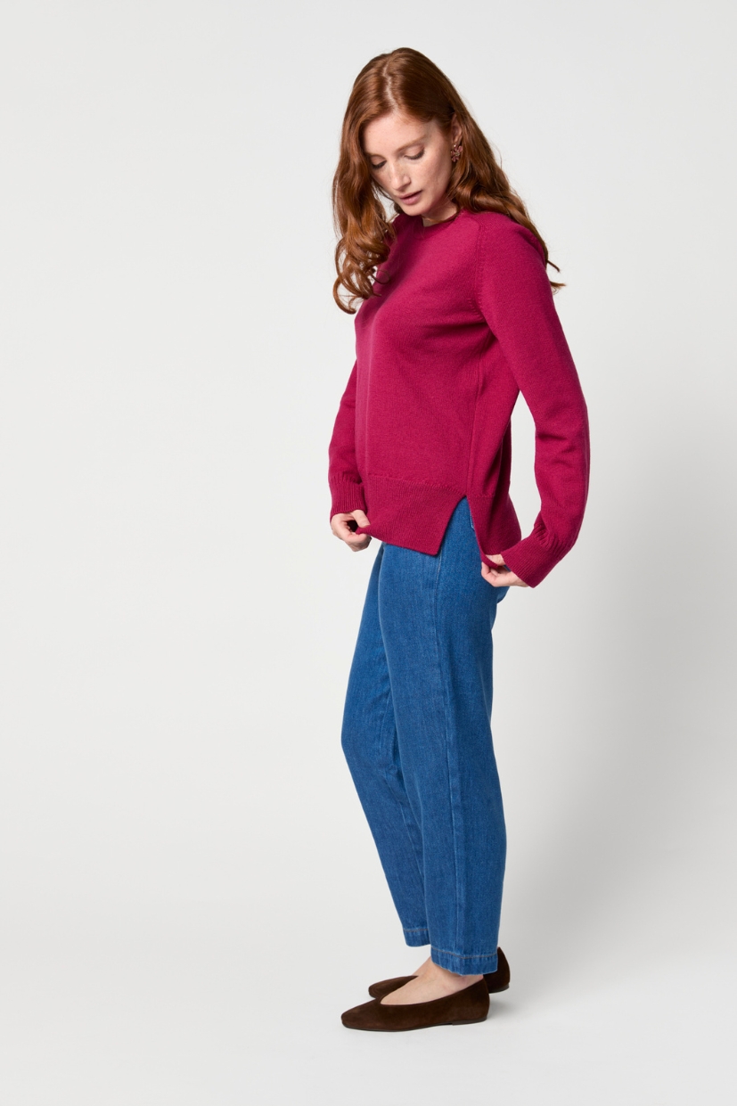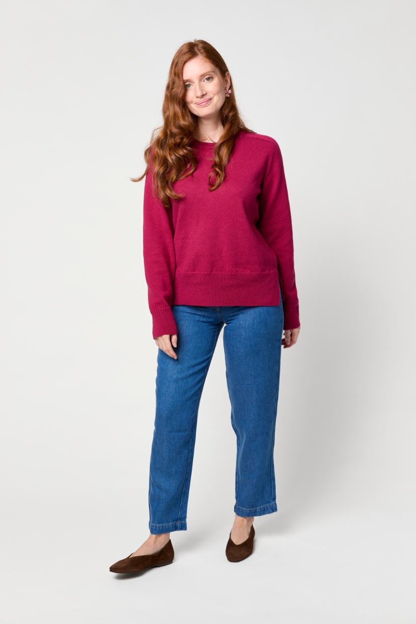 Le pull en laine bordeaux pour femme made in France bleu Nuit Zoé est tricoté dans notre fil exclusif 100% pure laine mérinos française.