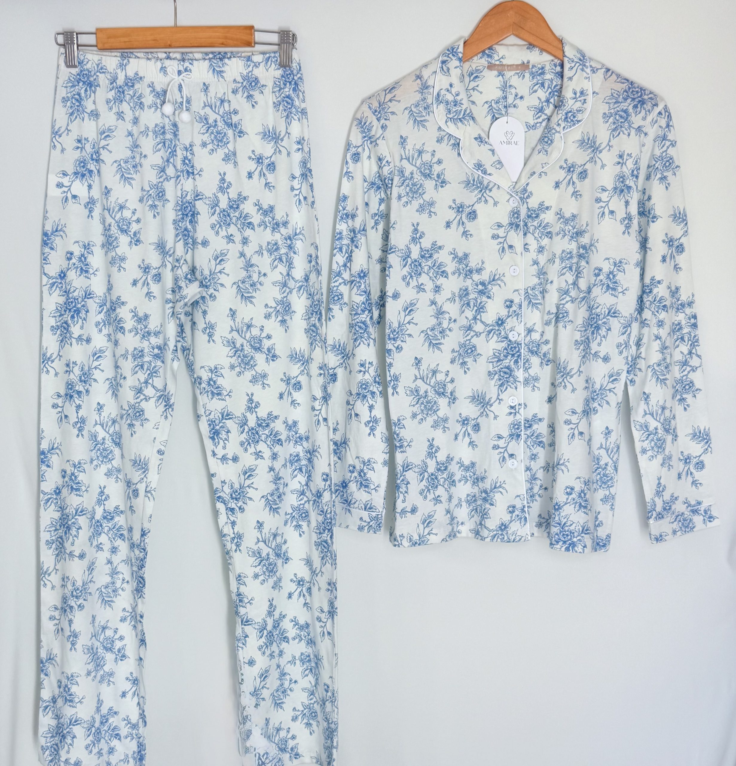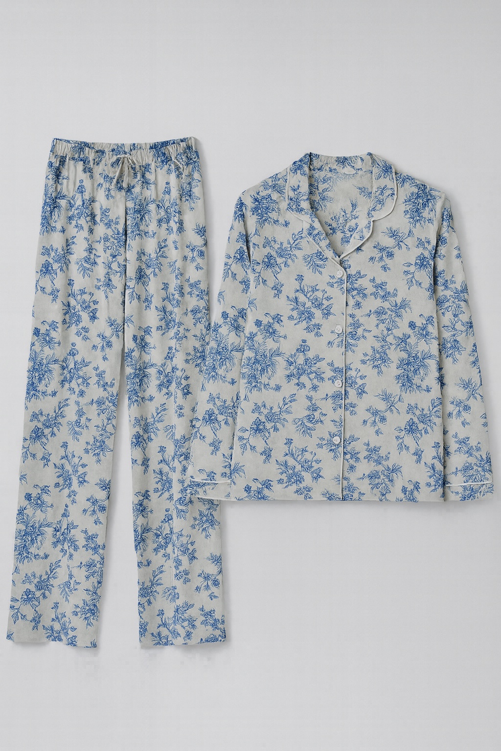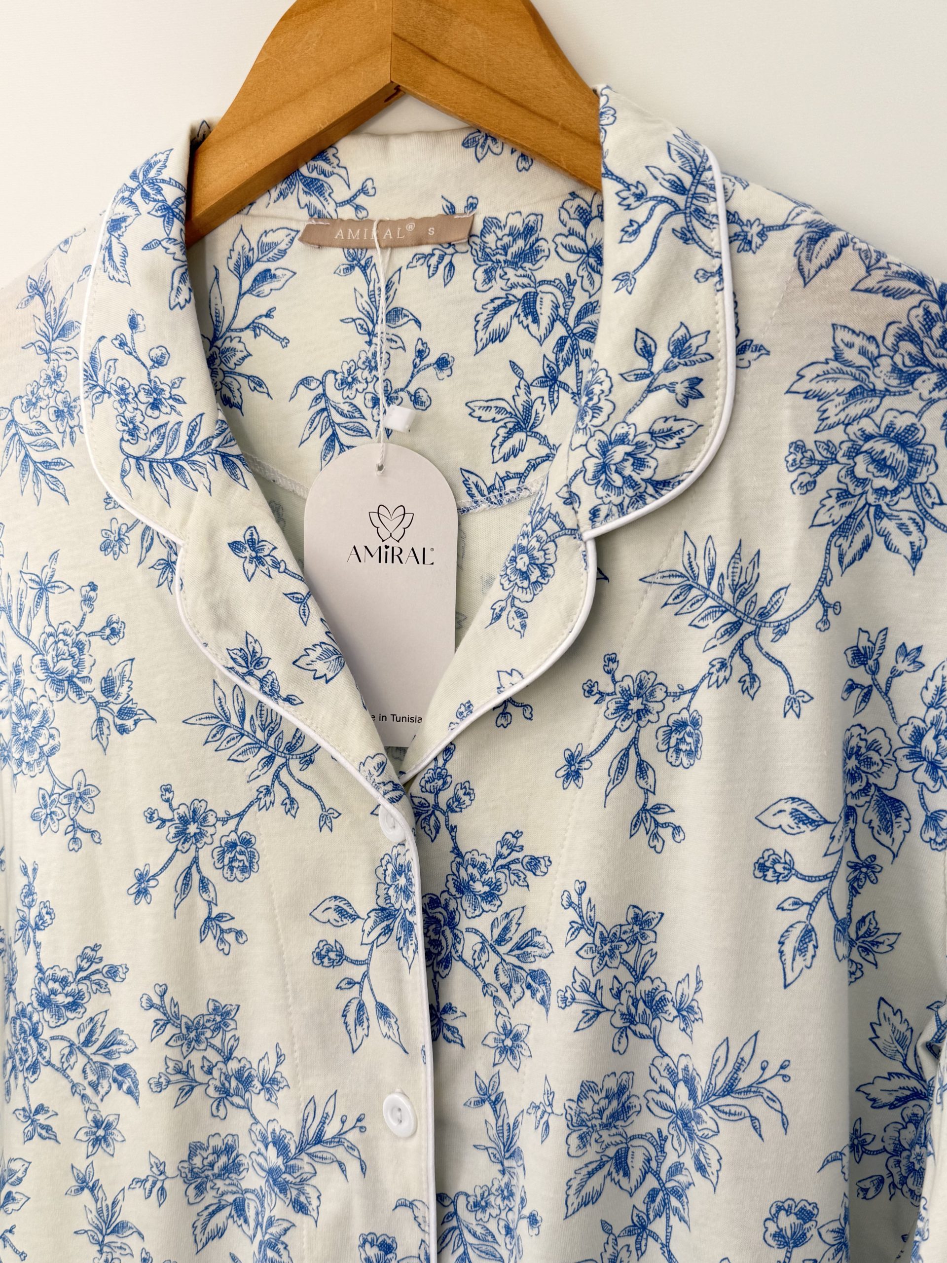 Élégance intemporelle et confort absolu réunis dans ce pyjama chemise en coton. Inspiré du célèbre motif Toile de Jouy, il arbore de délicates fleurs bleues sur fond blanc, pour un style raffiné et apaisant.