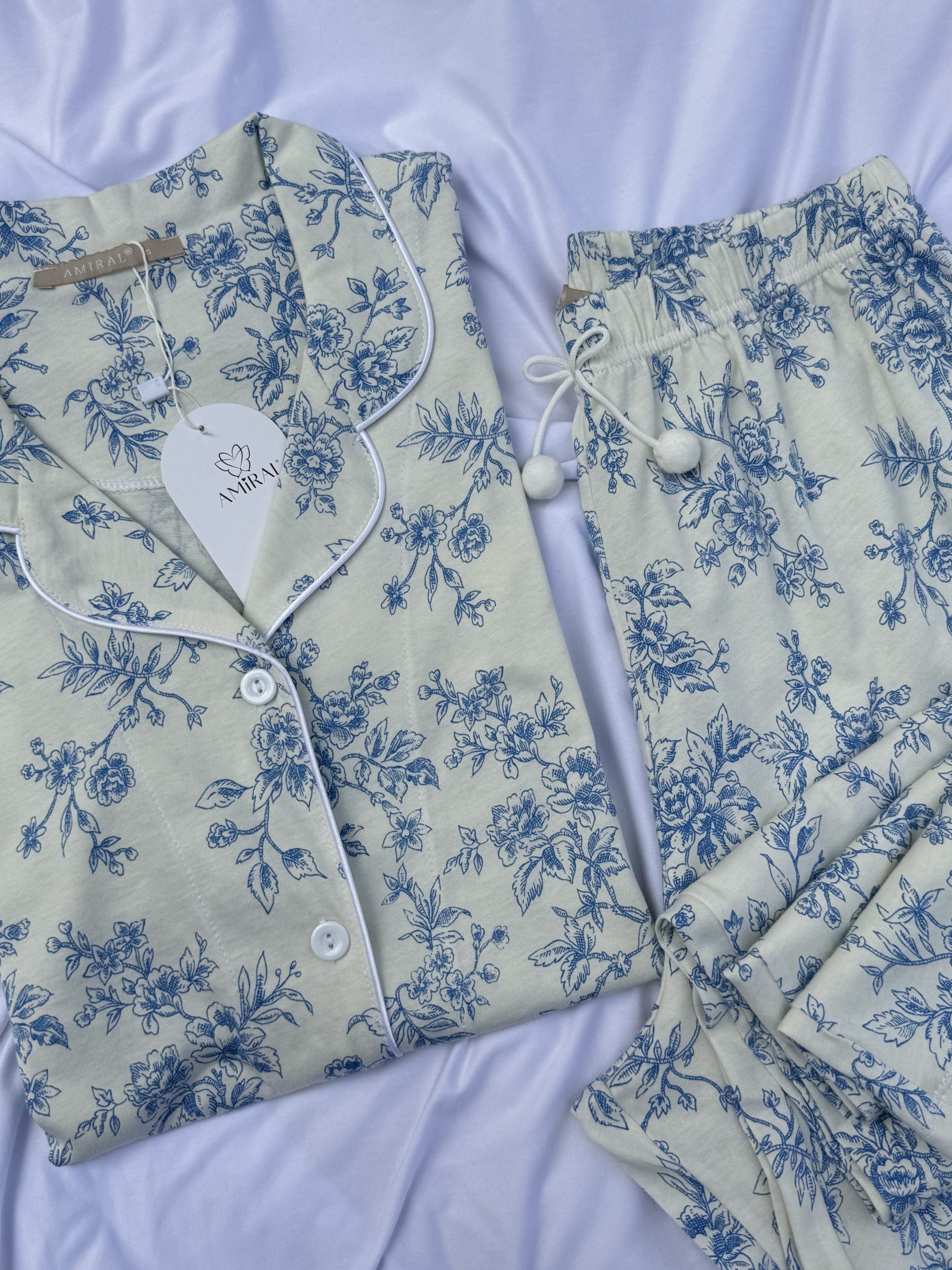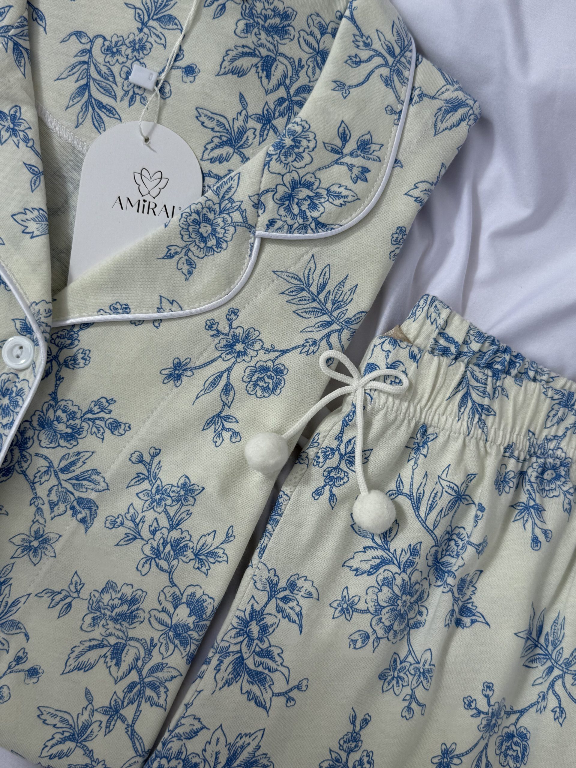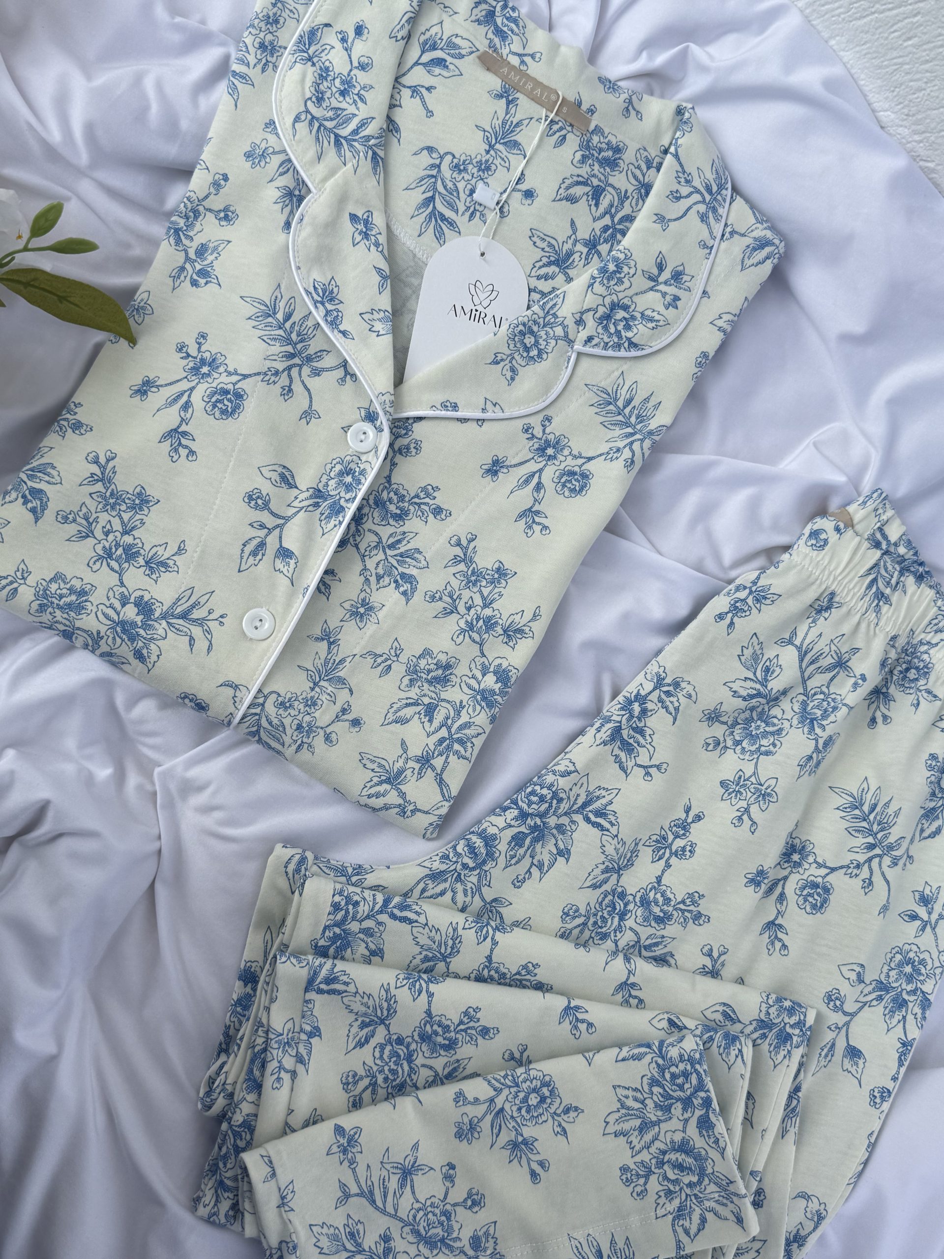 Élégance intemporelle et confort absolu réunis dans ce pyjama chemise en coton. Inspiré du célèbre motif Toile de Jouy, il arbore de délicates fleurs bleues sur fond blanc, pour un style raffiné et apaisant.
