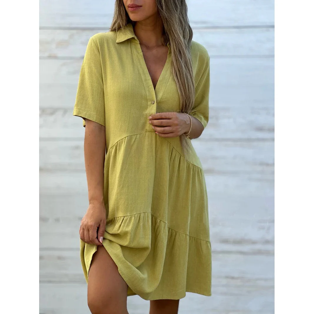 Cette robe chemise pour femme avec patte de demi-boutonnage combine style et charme. La coupe estivale et décontractée est à la fois flatteuse pour la silhouette et confortable. Le col chemise classique et les manches courtes confèrent une allure décontractée.