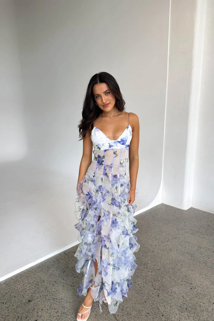 Faites sensation lors de vos événements spéciaux avec cette envoûtante robe longue fleurie Looksy. Son imprimé délicat et ses volants gracieux incarnent une élégance romantique, tandis que sa coupe fluide sublime votre silhouette avec féminité et légèreté.