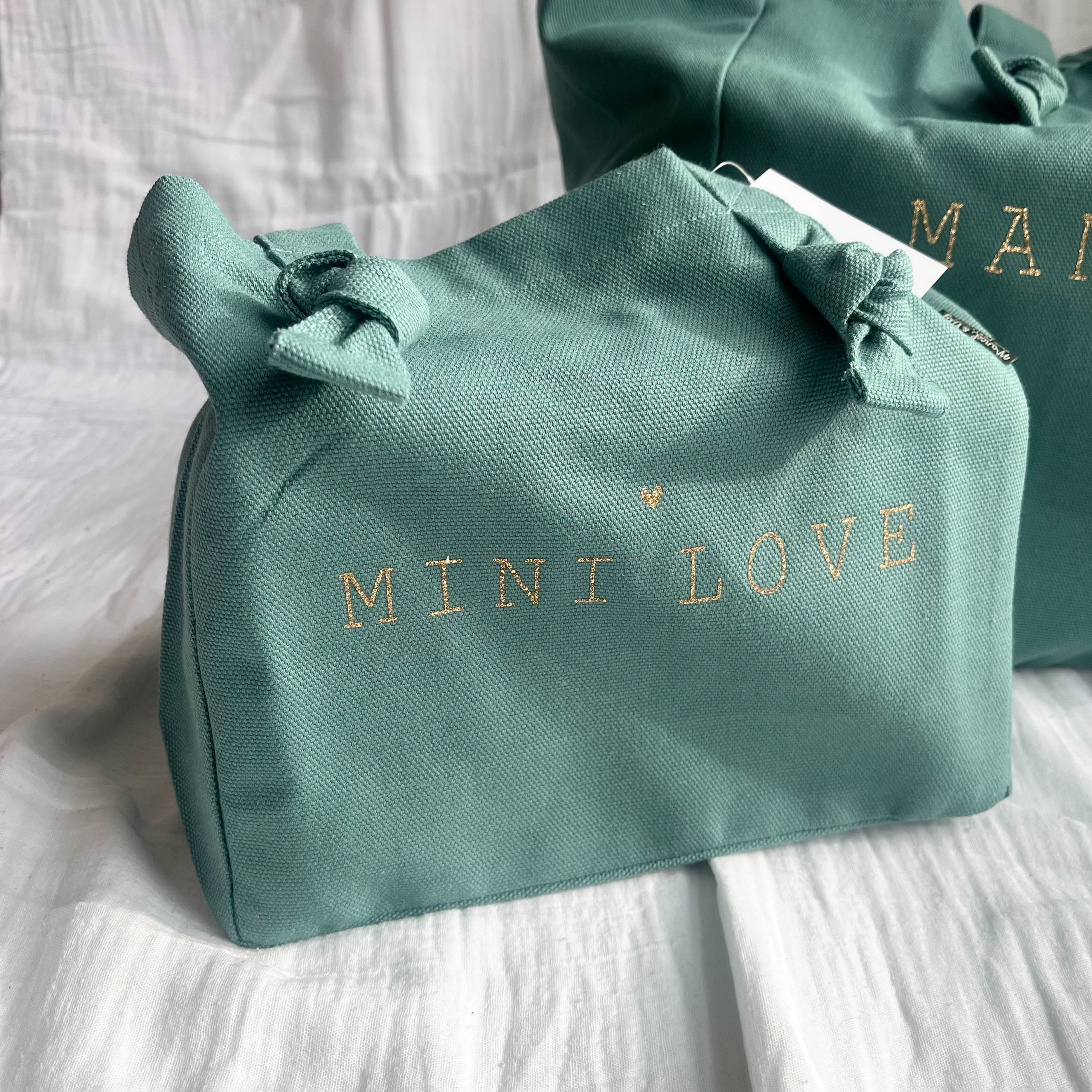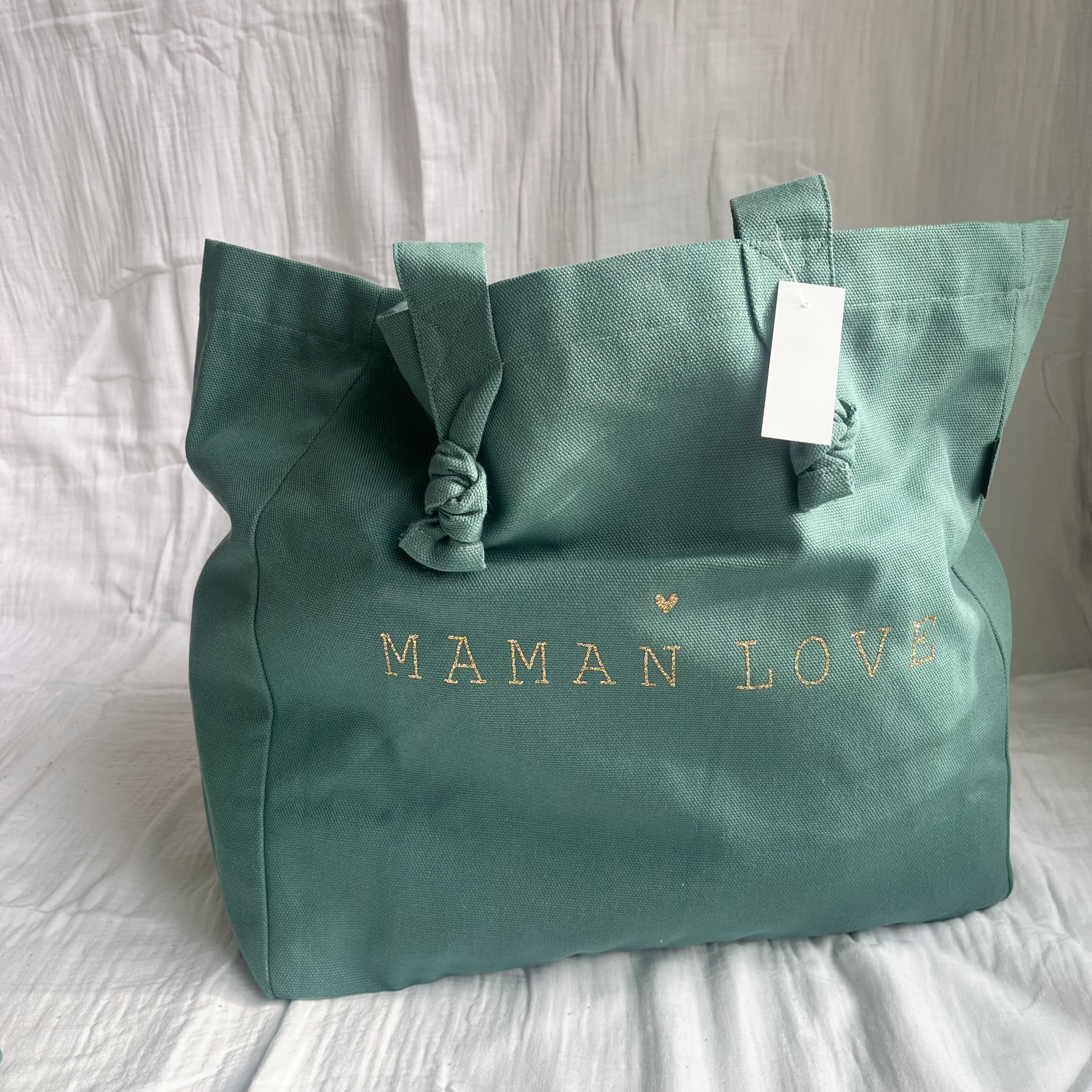 Grand cabas « Maman Love » avec ses noeuds très mignon, confectionné dans une jolie toile de coton 320 gr certifiée Oeko Tex couleur eucalyptus et son imprimé pailleté or.