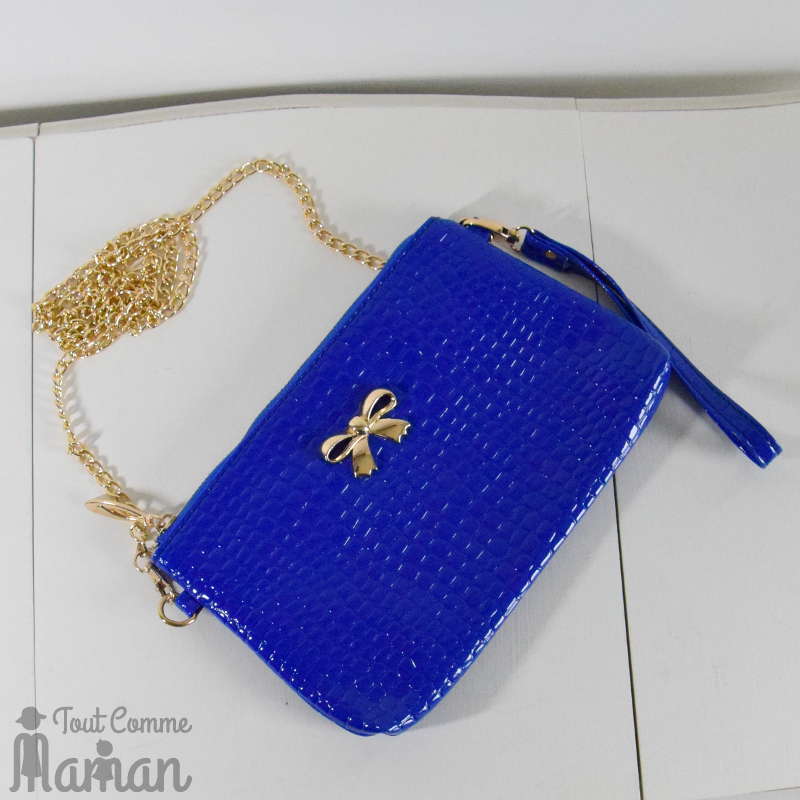 Sac bleu, lanière chaine dorée, fermeture éclair et petit nœud couleur doré. Poche intérieure avec zip.