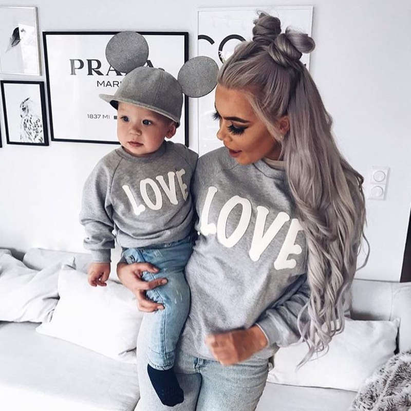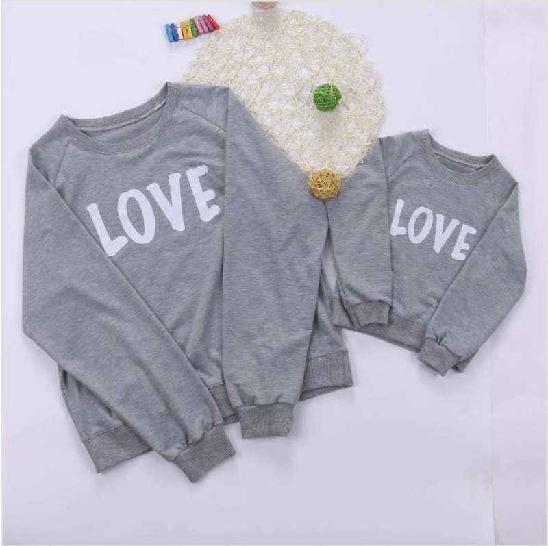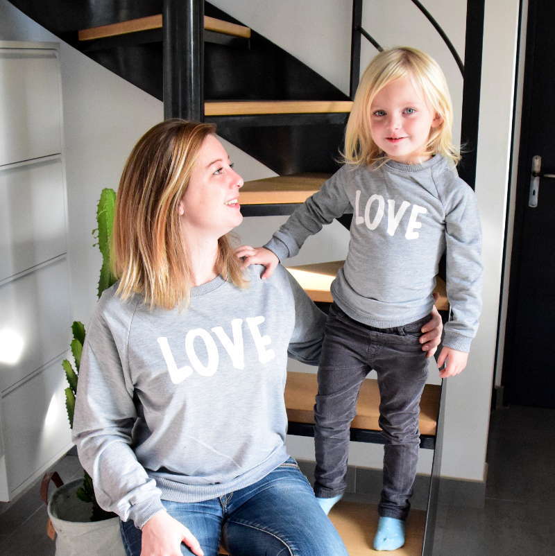 Sweat gris manches longues et col rond, inscription « LOVE » en blanc sur le devant.