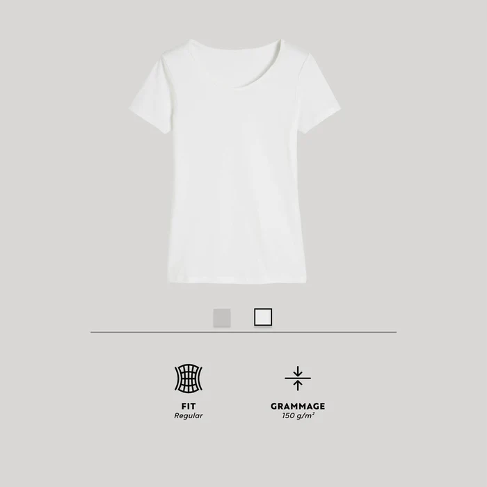 – Évitez de le faire sécher au sèche linge ou au soleil : les UV abîment les couleurs et fragilisent le tissu Quelle information m’apporte le grammage de mon t-shirt ? Pour un t-shirt, le poids, exprimé en grammes par mètre carré de tissu, va permettre de savoir si le tissu est plus ou moins épais. Cela va impacter sa transparence, son tombé et sa durée de vie : plus le grammage est important, plus le t-shirt va être opaque, plus il va avoir un beau tombé et cela lui confère une meilleure résistance dans le temps. Seul pour aller au sport ou comme base d’une tenue plus habillée, ce t-shirt peut tout faire ! Sa simplicité apparente cache un grand confort grâce à sa construction et son composant 100% coton. Vous cherchez un t-shirt simple ? 100% coton, 150g/m², coupe droite, col rond, ce t-shirt a tout du basique parfait à toujours avoir dans son placard.