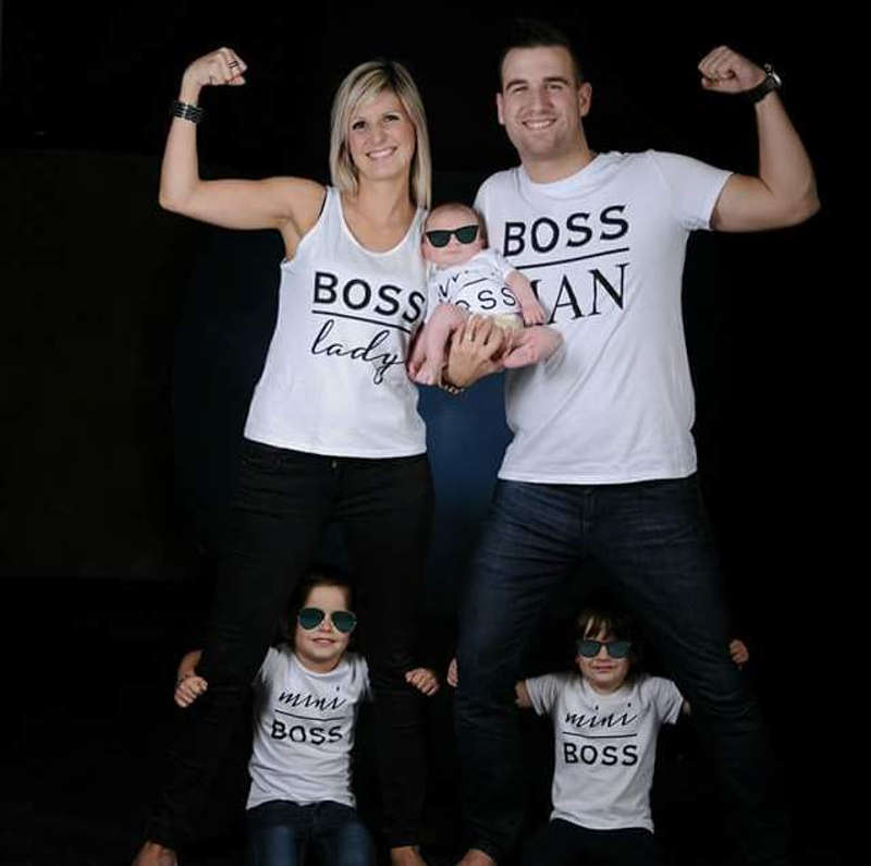C’est qui le boss? Tee-shirt blanc manches courtes, col rond avec inscription « MINI BOSS » pour enfant et « BOSS MAN » pour papa ( ou papi ou tonton..). Débardeur blanc avec inscription « BOSS LADY » pour maman ( ou mamie, ou tata…). A partir du 0/3 mois. composition : 100% coton Body du 0 au 18 mois. Tee-shirt du 12 mois au 8 ans.