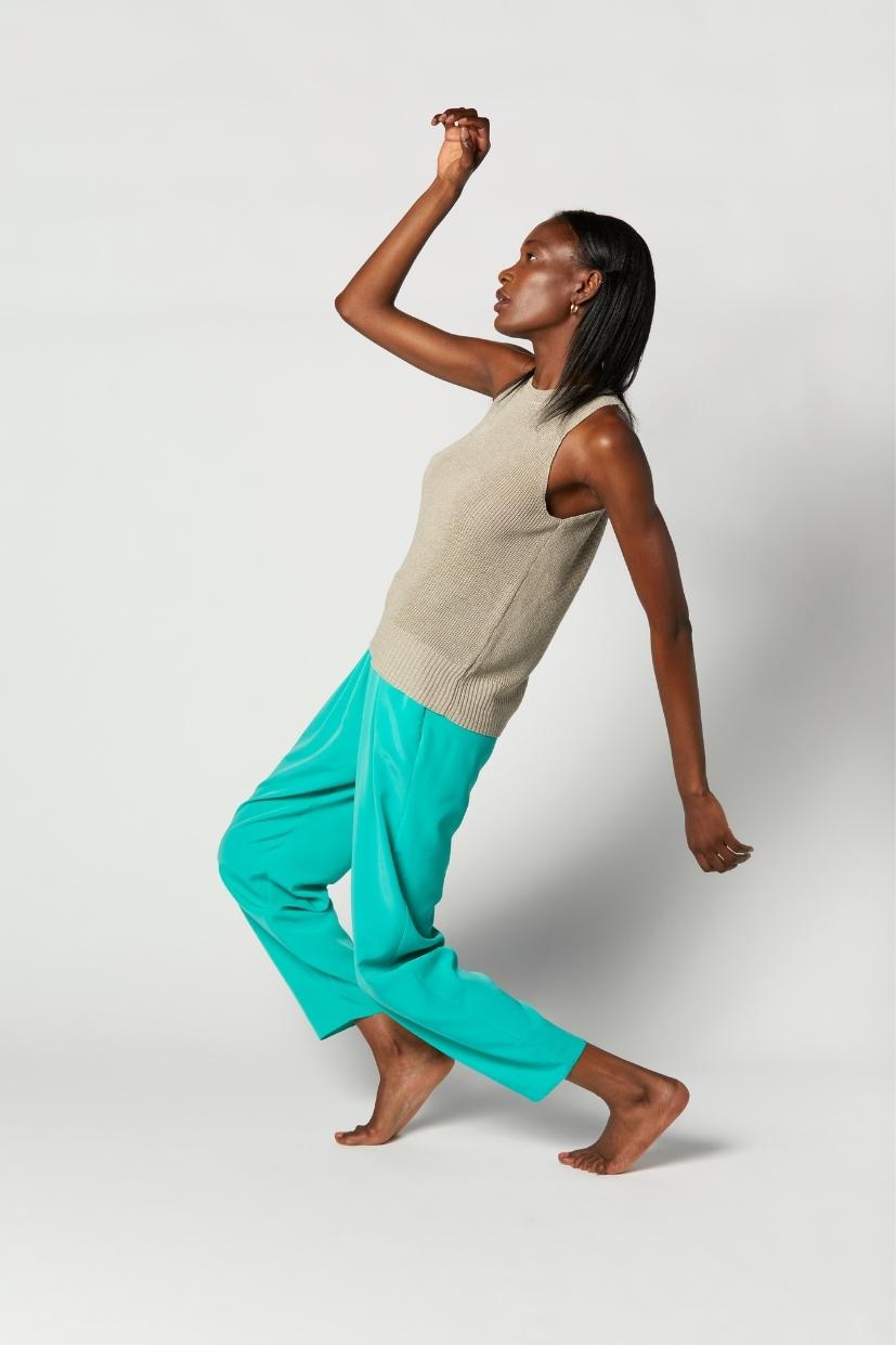 Le top Aloi se porte tel quel ou rentré dans une jupe ou pantalon à la taille moyenne ou haute.