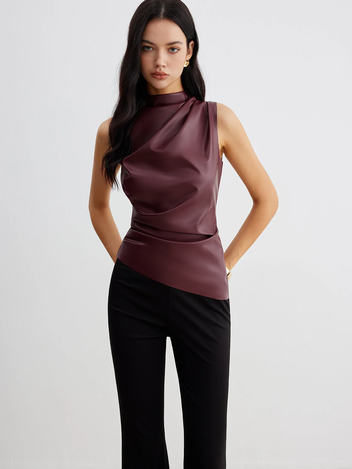 Ce top sans manches en similicuir apporte une touche rock et moderne à votre look grâce à son effet drapé asymétrique. Le col montant et la finition lisse confèrent une élégance contemporaine, idéale pour vos événements chics.