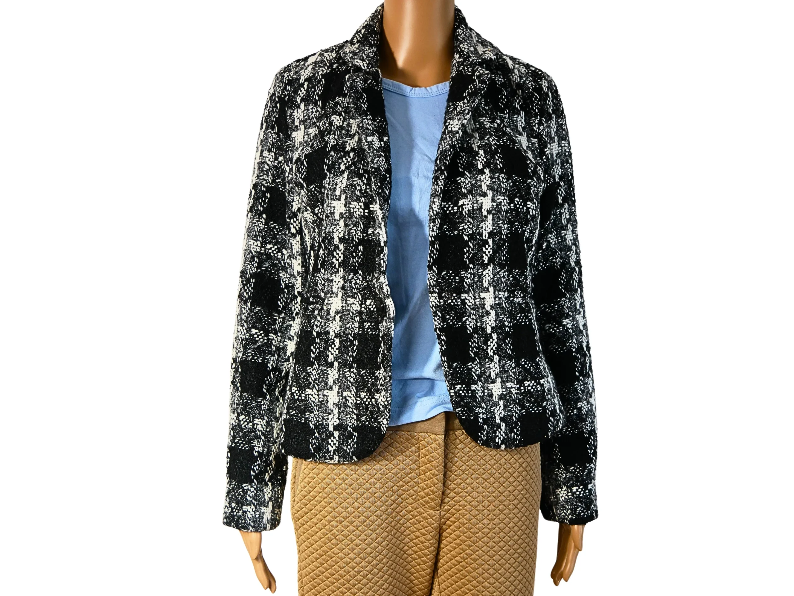 Apportez une touche de sophistication à votre garde-robe avec cette veste en tweed noir et blanc pour femme de la marque Quiosque. Taille EU38, mesure 55cm en longueur et 38cm en largeur, ce blazer apportera une allure élégante et féminine à toutes vos tenues. Osez le style chic et intemporel avec Quiosque !